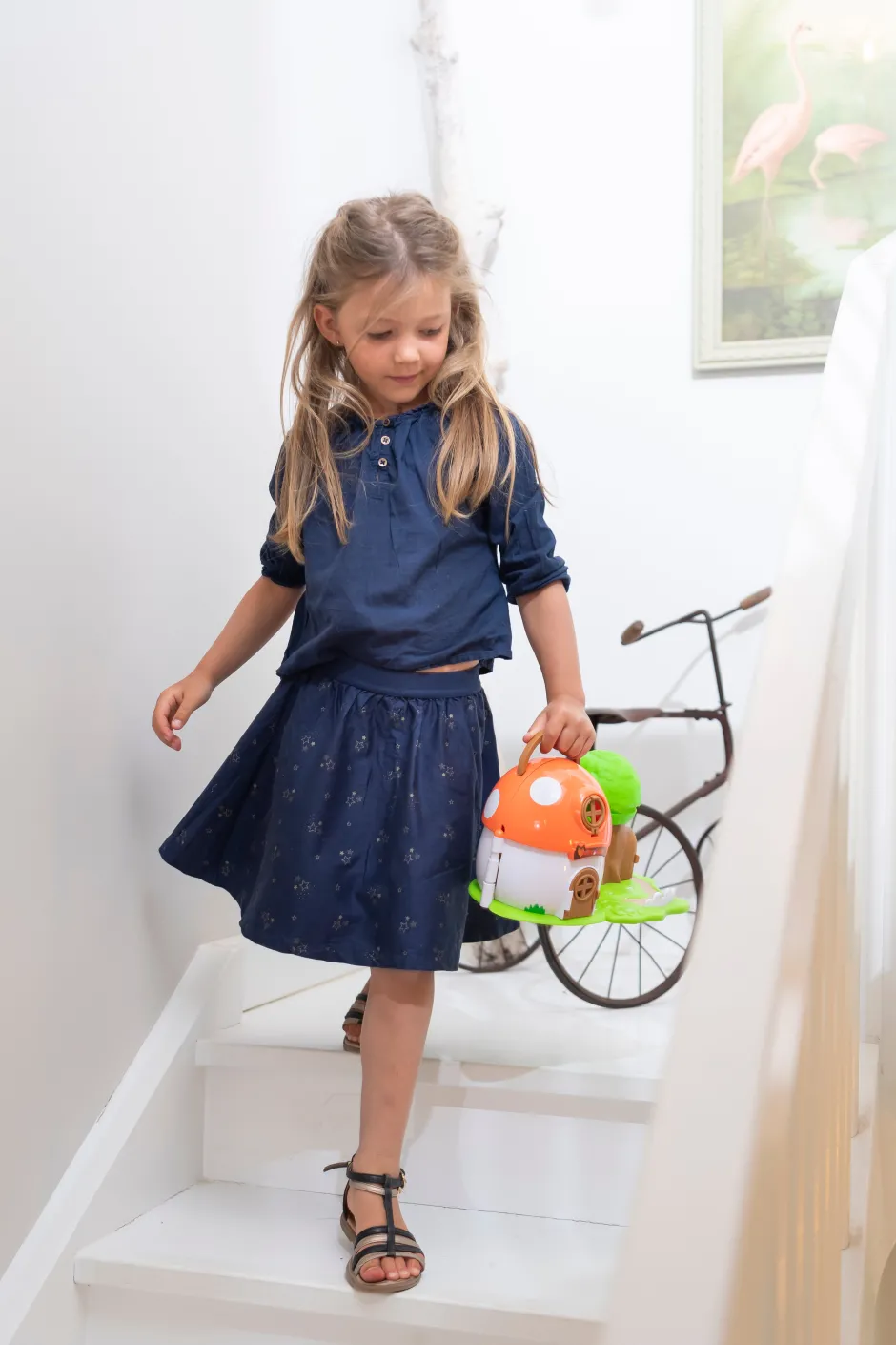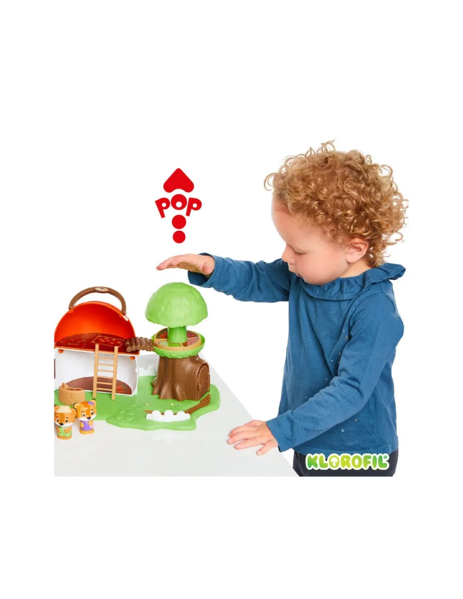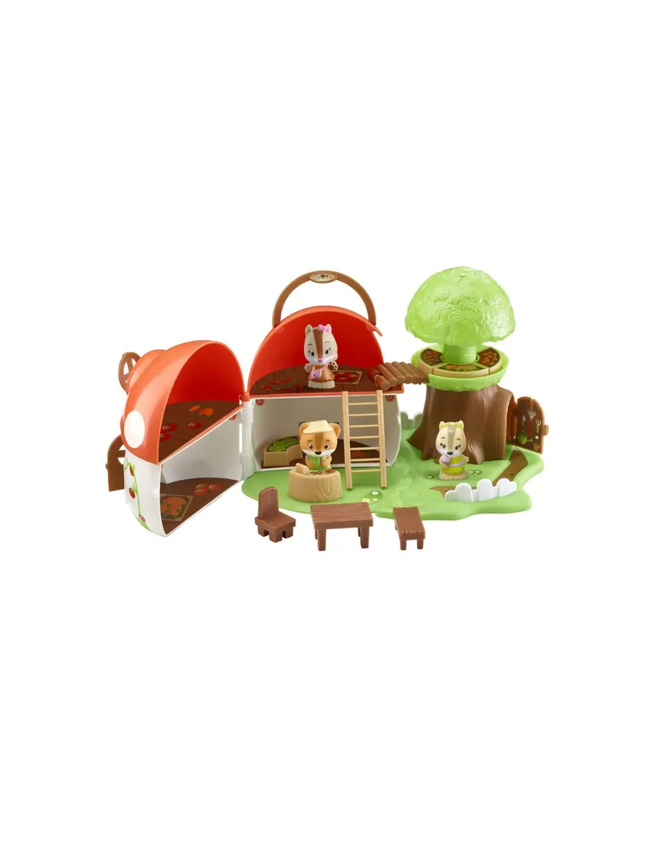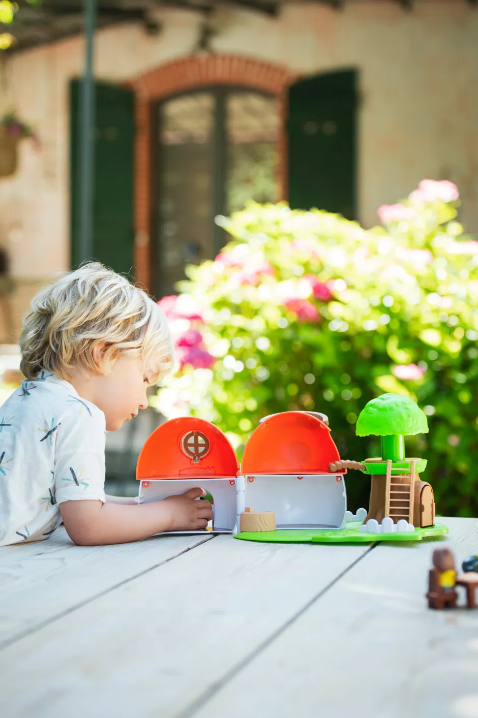 Sorpresa! El champiñón se abre para revelar una tienda de 2 pisos. Ideal para reproducir escenas de la vida cotidiana. ¡Presiona el arbusto y «¡Pop!», descubre lo que está escondido dentro! Muchas actividades para divertirse: un puente, una puerta y una ventana extraíble, un escondite secreto, accesorios…