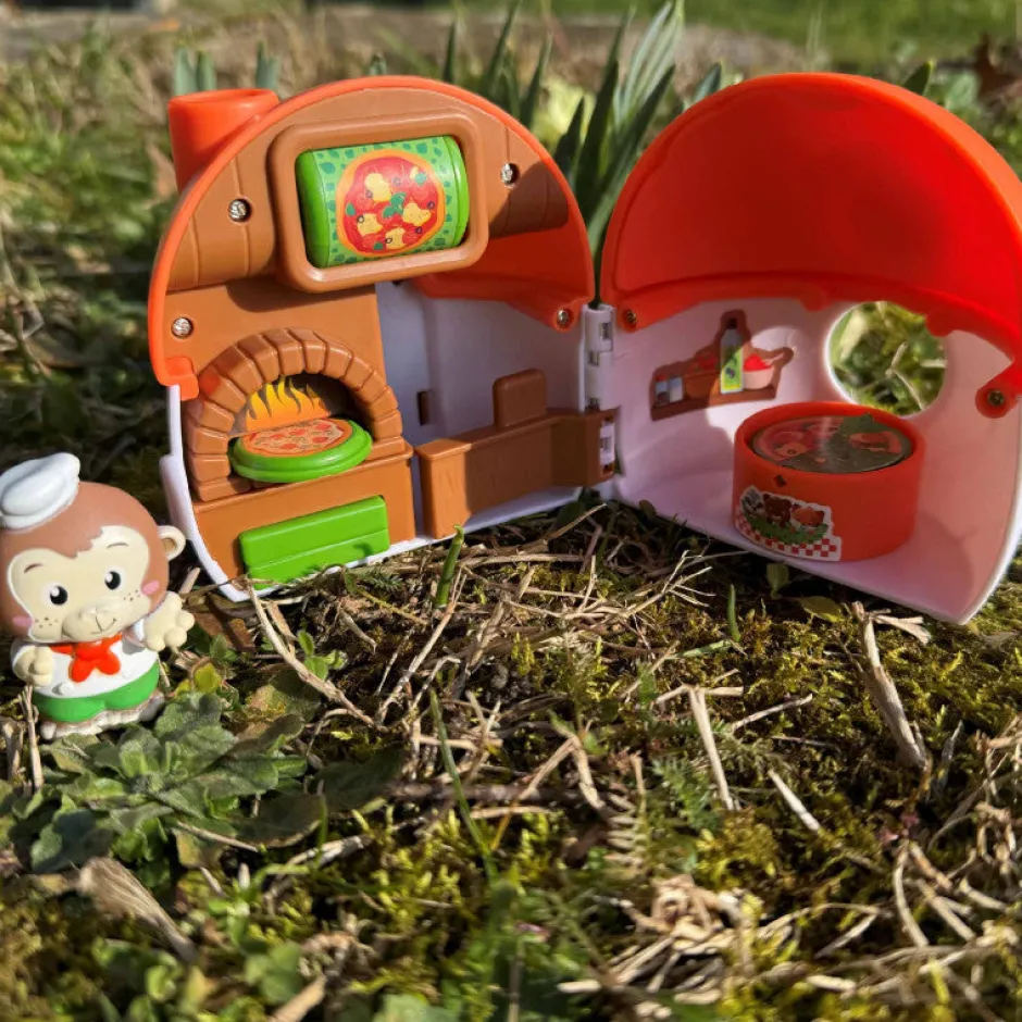 Hay un montón de acciones y sorpresas por descubrir para contar tus propias historias: un menú desplegable para elegir la pizza, un botón emergente para sacar la pizza del horno y una mesa reversible.