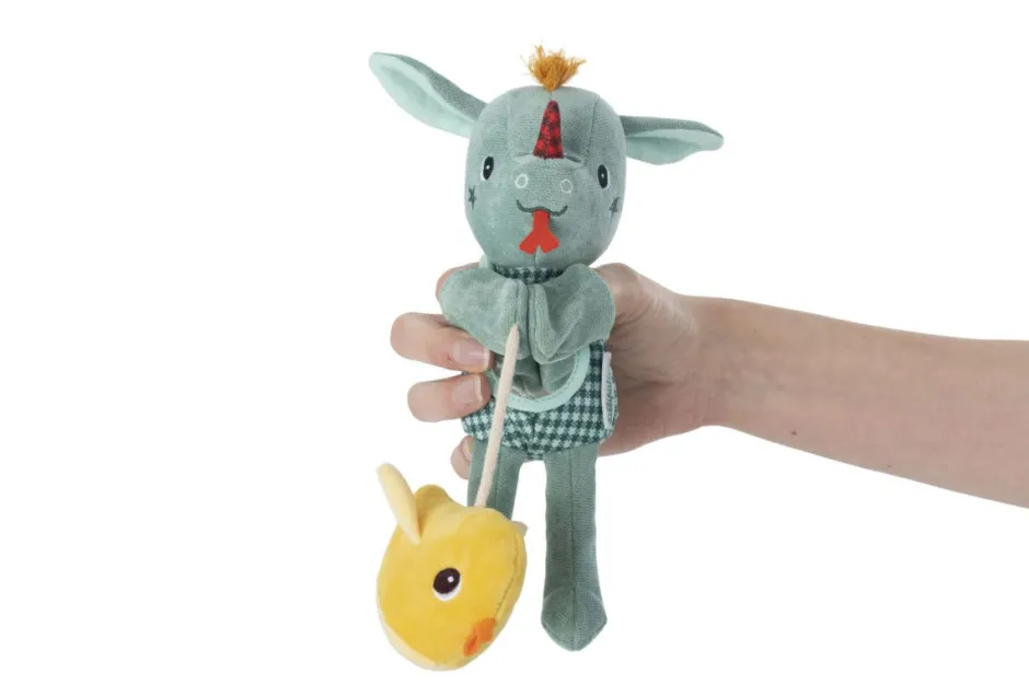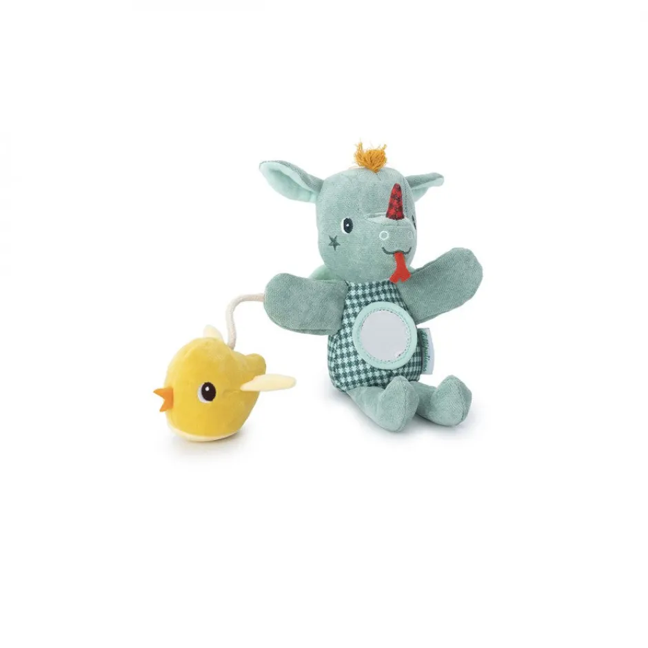 La pequeña marioneta blandita de Joe el dragón toma vida como por arte de magia para el mayor placer de los pequeños. El pajarito crepitante y el espejo despiertan los sentidos de los más pequeños.
