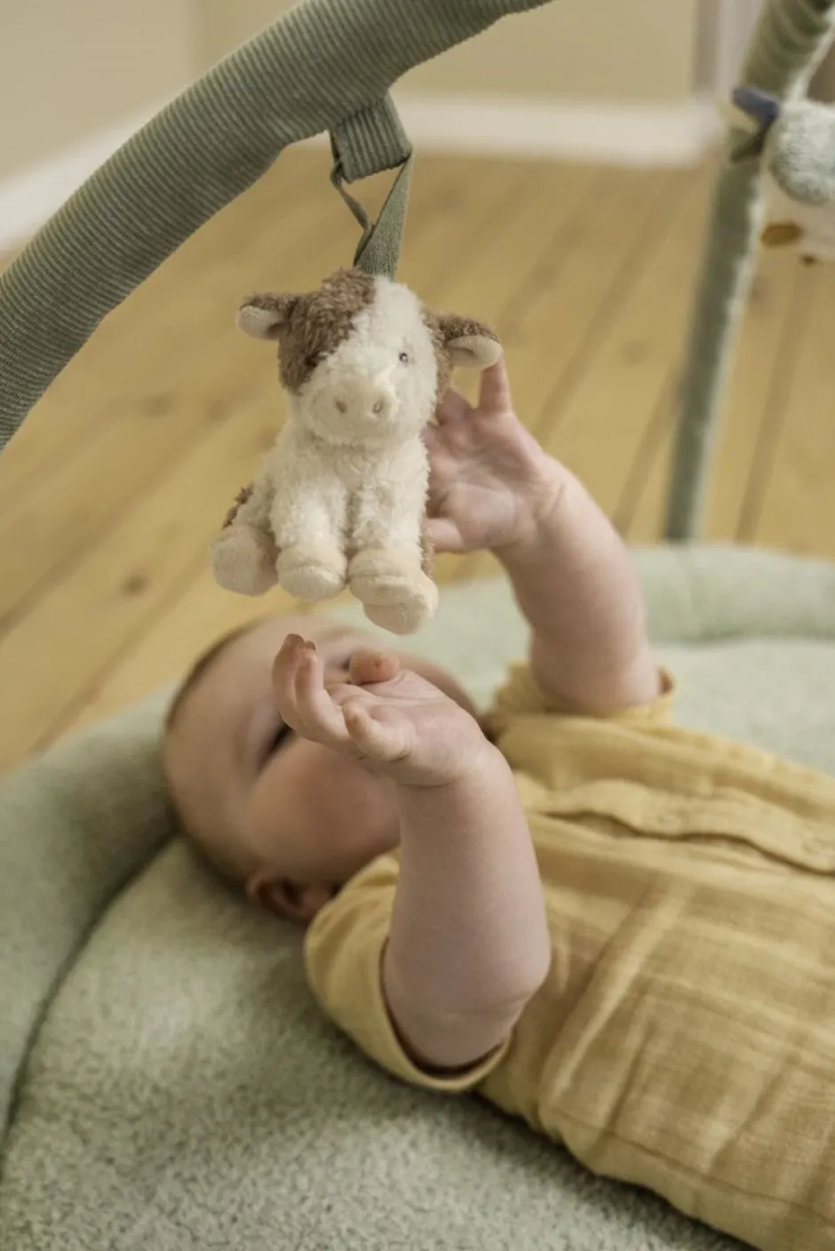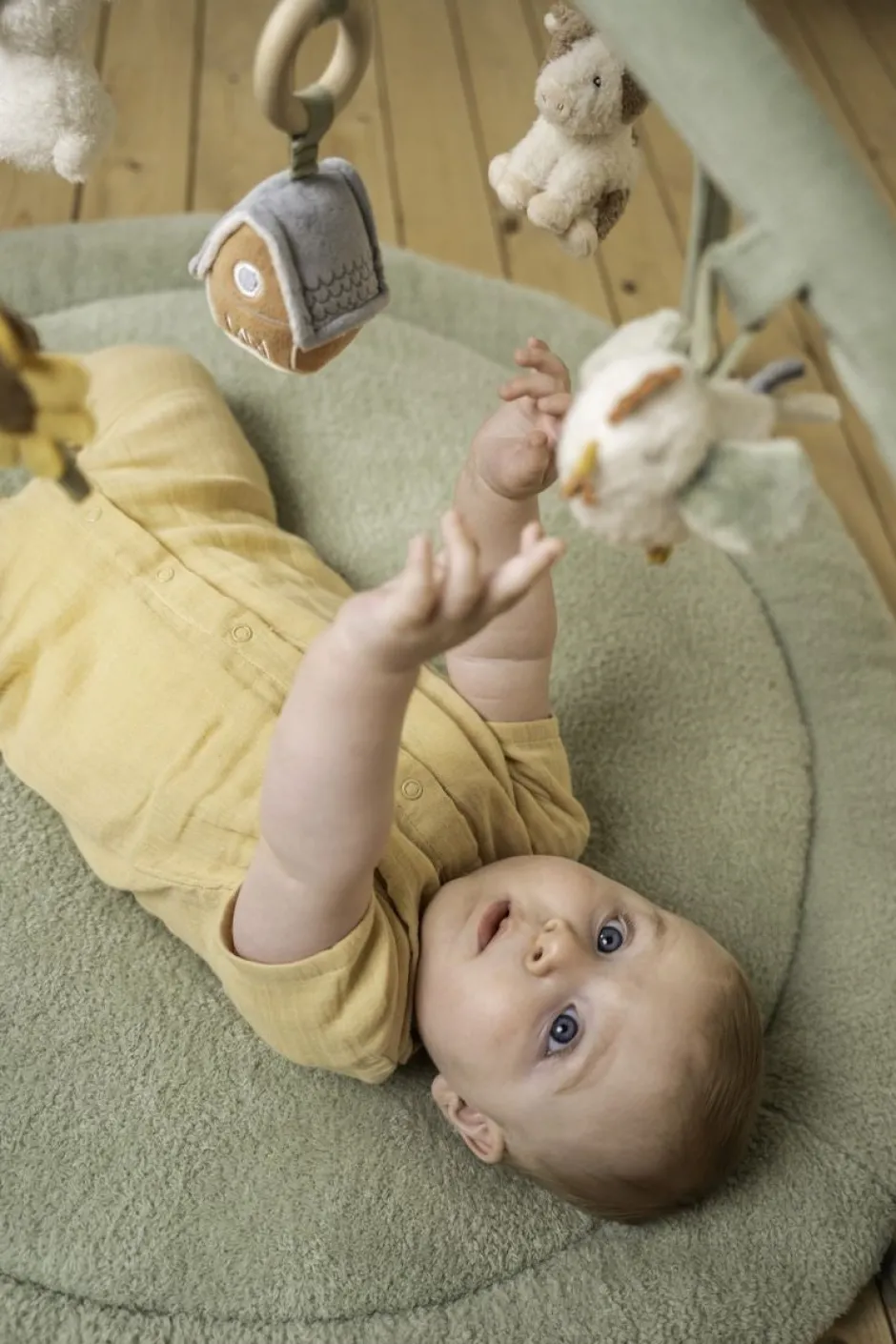 Fomenta la exploración. Desafiará a tu pequeño a moverse, alcanzar y agarrar con esta alfombra de actividades cautivadora. La alfombra es super suave, tiene forma redondeada en la base con un grosor de 2 cm, lo que la hace muy confortable y está inspirada en la estética de la granja de la colección Little Farm, con 5 diferentes suaves juguetes colgantes que mantendrán a su bebé entretenido y desarrollará la coordinación ojo-mano.