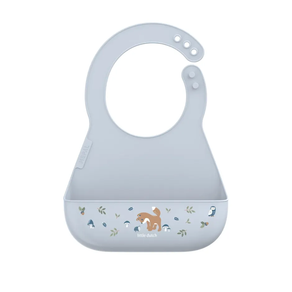 Babero de silicona de la colección MIO con cierre ajustable en el cuello y bolsillo profundo para atrapar la comida. Fácil de limpiar y transportar.