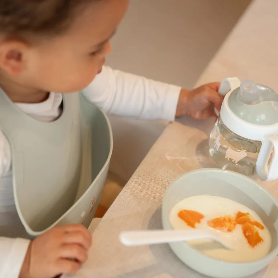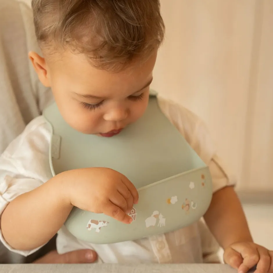 Babero de silicona de la colección MIO con cierre ajustable en el cuello y bolsillo profundo para atrapar la comida. Fácil de limpiar y transportar.