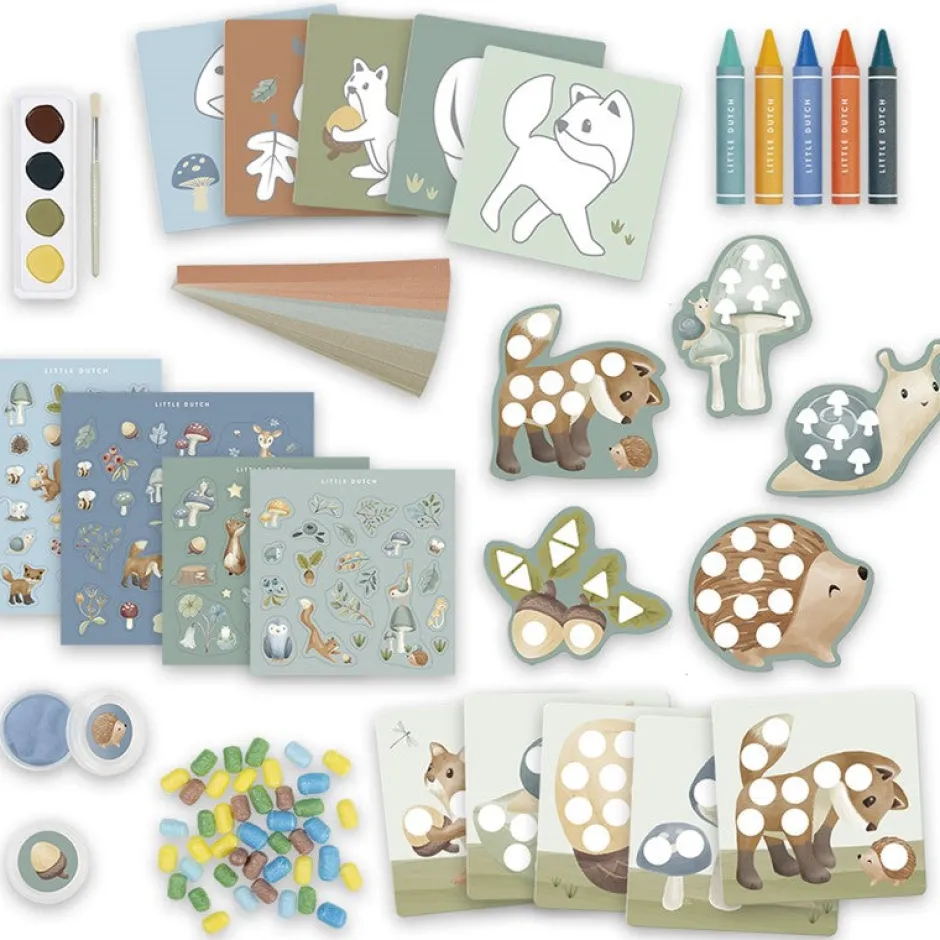 Caja de creatividad Forest Friends con todo lo que necesitas para empezar a ser creativo inmediatamente, por ejemplo: pegatinas, papel de dibujo, ceras, pintura, arcilla expandida, sellos, pegatinas, etc.