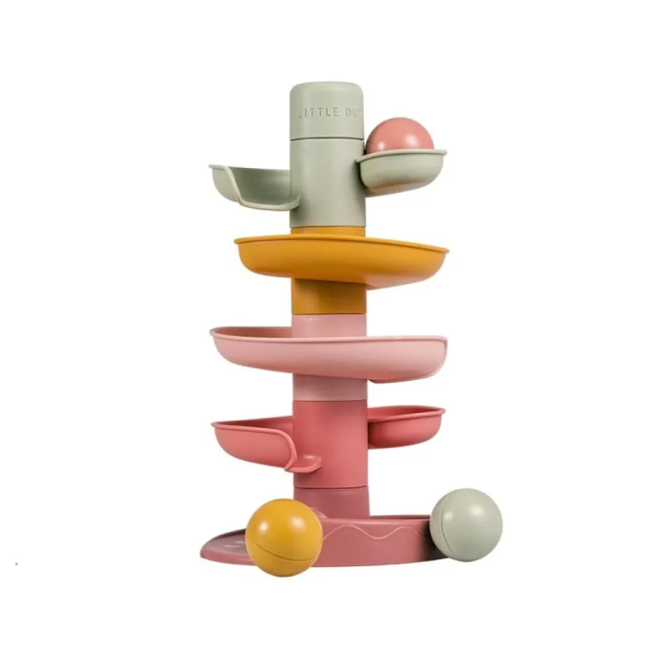 El colorido juguete consta de 5 piezas de tonos suaves que su pequeño puede apilar fácilmente. Deje caer las bolas una por una en el nivel superior y vea cómo cada una de ellas se enrolla y rueda hacia abajo.