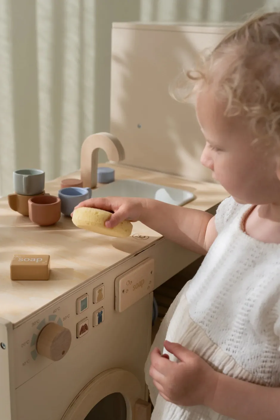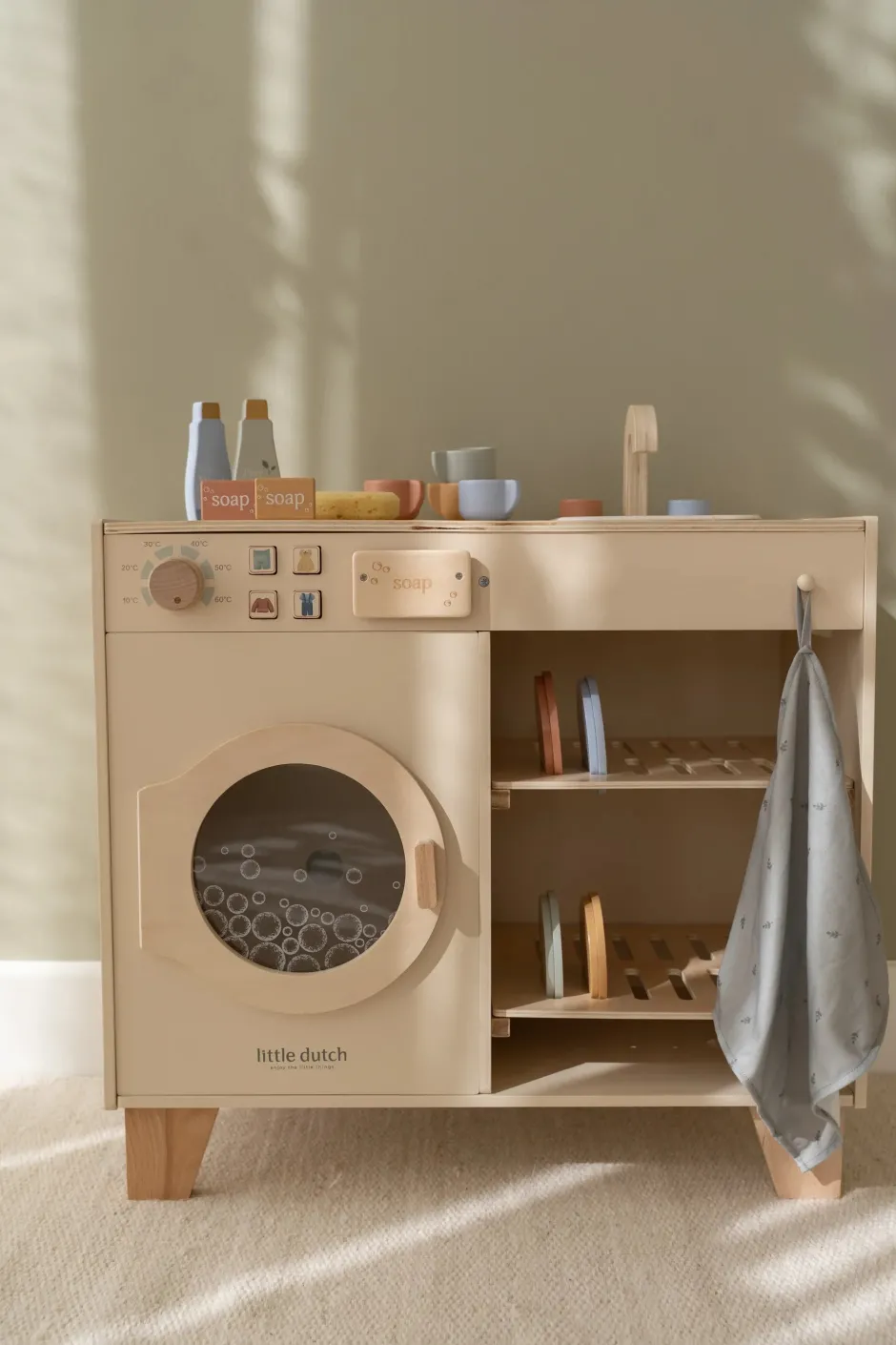 Con esta lavadora y lavavajillas de madera, las tareas del hogar se convierten en una auténtica aventura. El set incluye cuatro tazas, cuatro platitos, dos platos, detergente, pastillas de jabón y un paño de cocina. Lava los platos en el fregadero y lava la ropa de la muñeca en la lavadora. Los botones realistas con ilustraciones y el compartimento especial para la pastilla de jabón hacen que jugar sea aún más divertido. Combina la lavadora y el lavavajillas con la cocina de juguete y el frigorífico para crear un rincón de cocina completo. Diversión sin límites para los pequeños héroes del hogar.