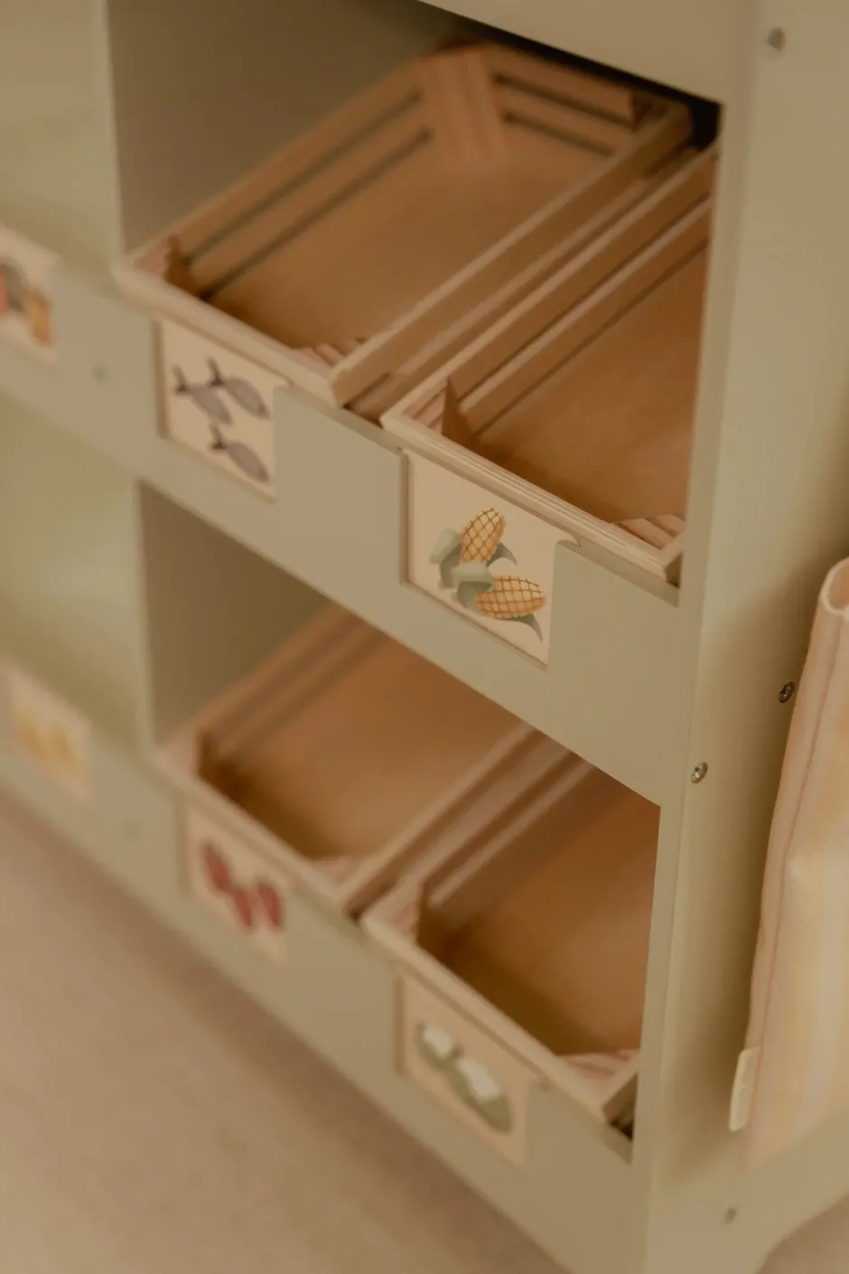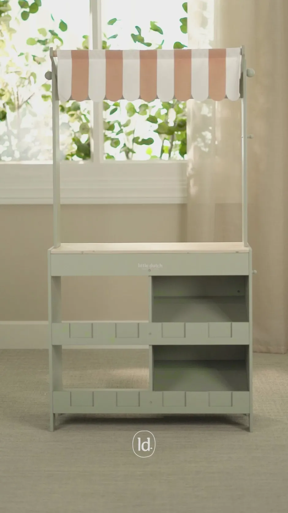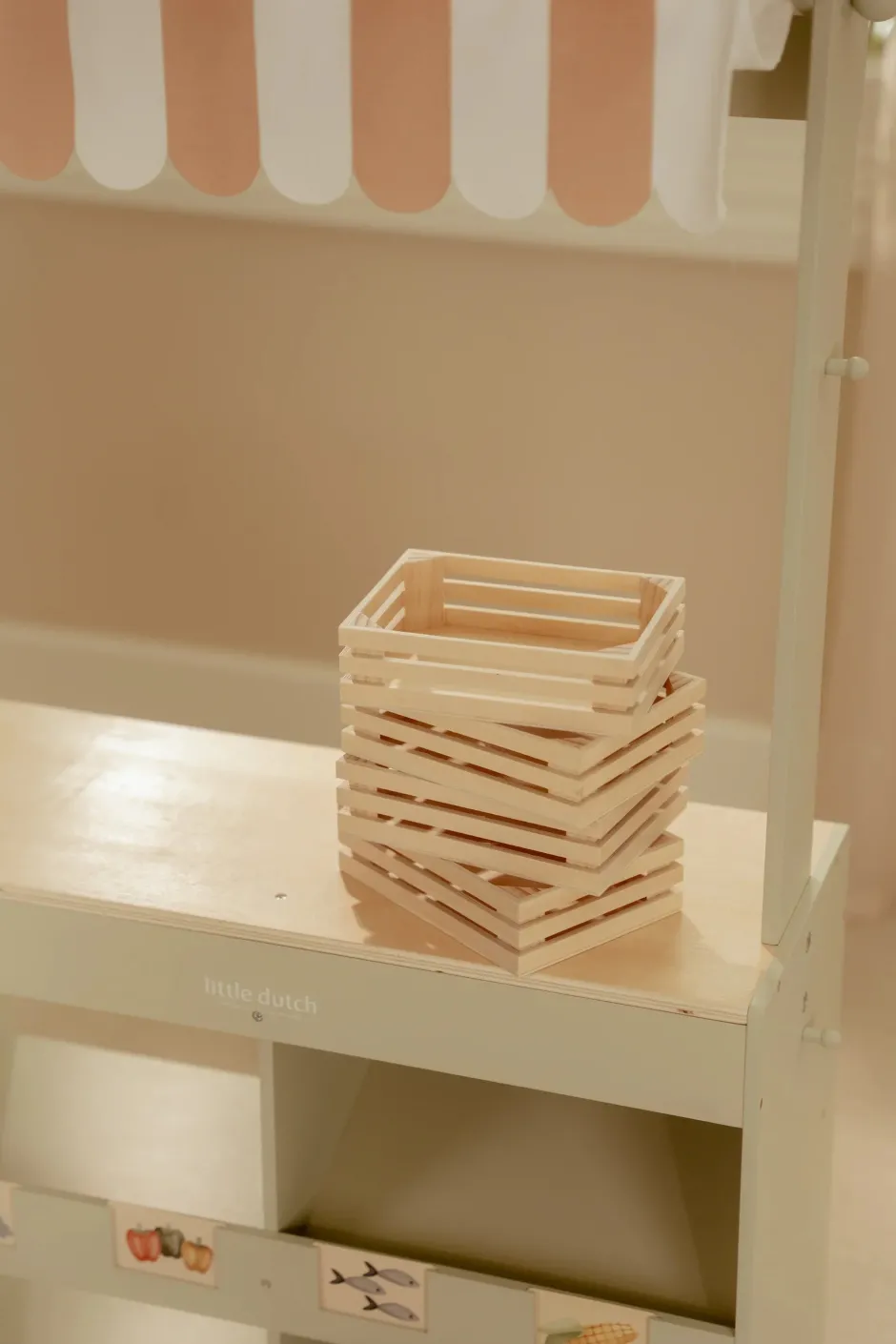 ¡Bienvenidos al mercado! Con este precioso puesto de madera, los niños pueden jugar a comprar en su propia tiendita. La marquesina de tela crea un auténtico ambiente de mercado, y con la pizarra y las tarjetas ilustradas, pueden exponer sus productos con estilo. El set también incluye una bolsa de la compra y cajas para una auténtica experiencia de compra. Dale la vuelta al puesto y se convierte en una cafetería, con menú y alegres ilustraciones. Combínalo con la caja registradora, la báscula o el expositor de pasteles para disfrutar aún más jugando. ¿Qué hay en el menú de hoy?