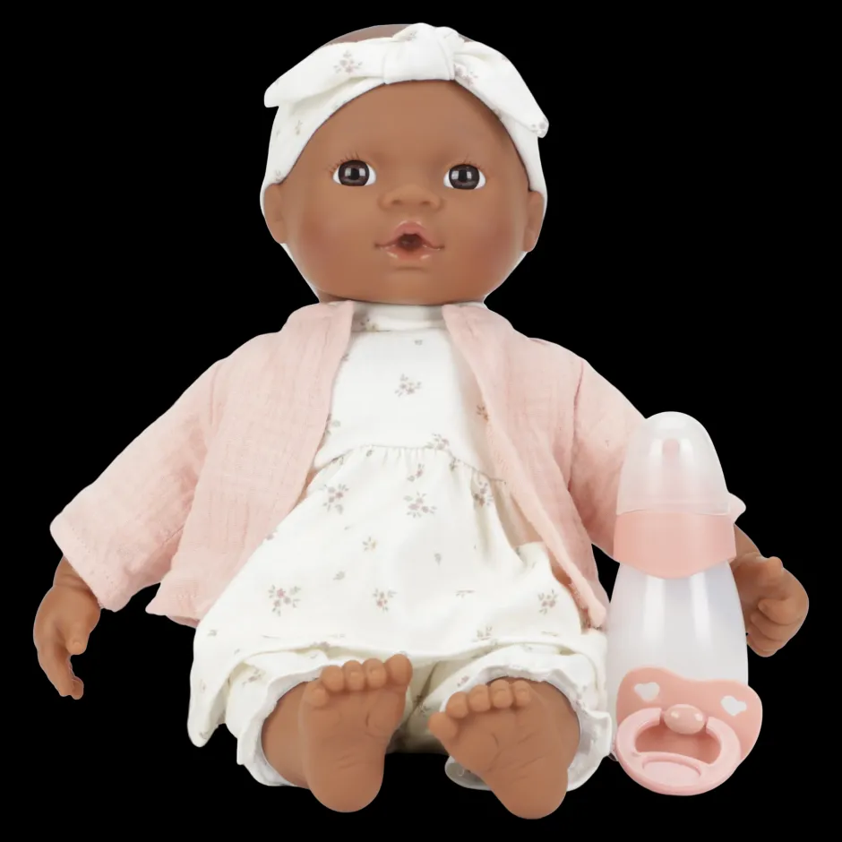 Conoce a la bebé Noa. Dale un abrazo y cuídala. Noa es una muñeca adorable y realista, con un cuerpo suave y mimoso, a la que le encanta que la quieran. Puedes cambiarle de ropa, ayudarla a dormir y calmarla con el chupete. Cuando tenga hambre, ofrécele el biberón de leche. A los niños les encanta imitar todo lo que hacen sus padres, y esta muñeca inspirará a su pequeño a participar en juegos de roles de crianza y cuidado. Noa está vestida con una diadema, un vestido y pantalones del diseño White Meadows, con un chaleco rosa suave.