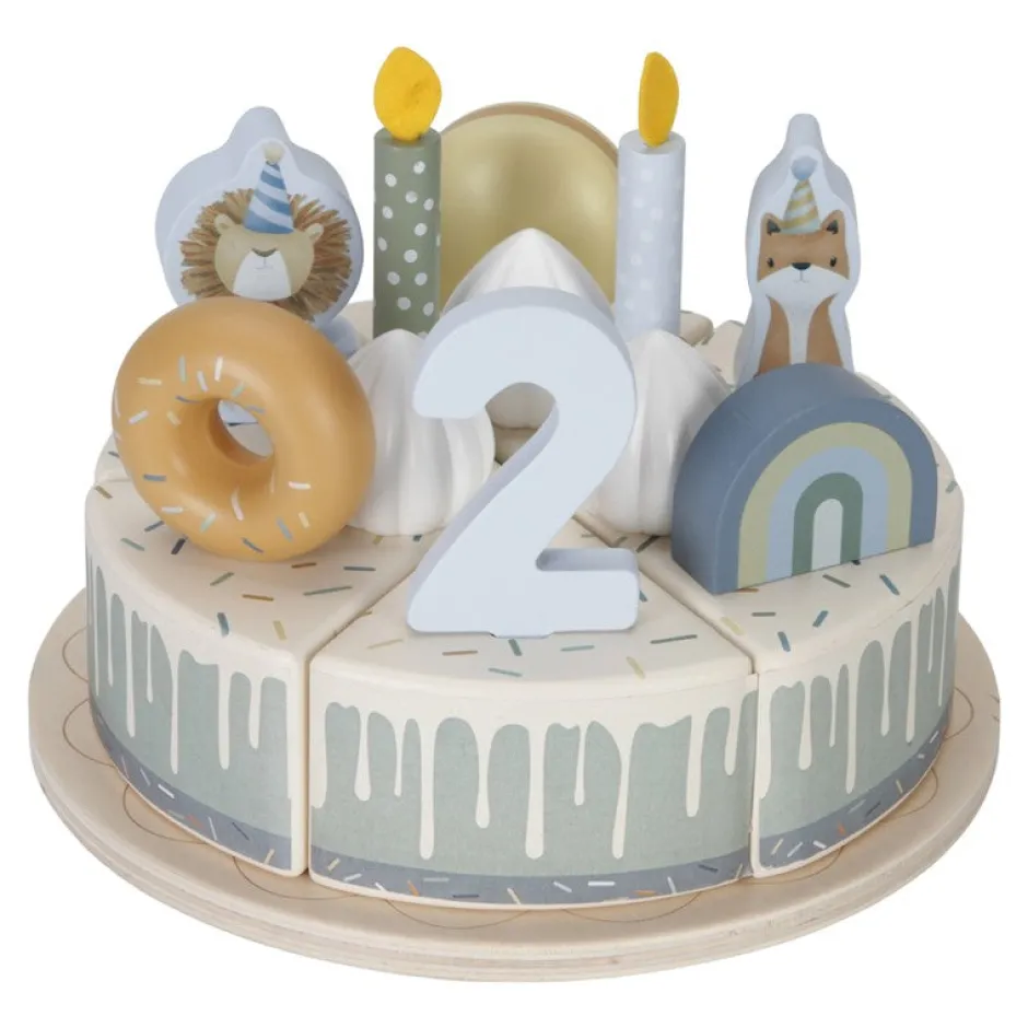El set incluye: 6 porciones de pastel de quita y pon, una pala para servir, donut, macaron, pájaro, mariposa, arco iris, velas, nata montada para el topping y número del 1 al 5. 26 piezas en total.