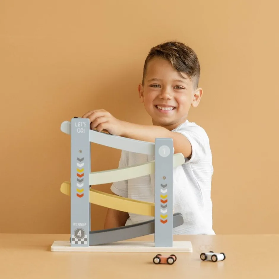 1, 2, 3 y ¡empieza! Con esta alegre rampa de carreras de madera que incluye 4 coches, tu pequeño se lo pasará en grande. Coloca los autos uno por uno en la parte superior de la pista de carreras, déjalos ir y correrán hacia abajo. ¡A los niños les encanta!