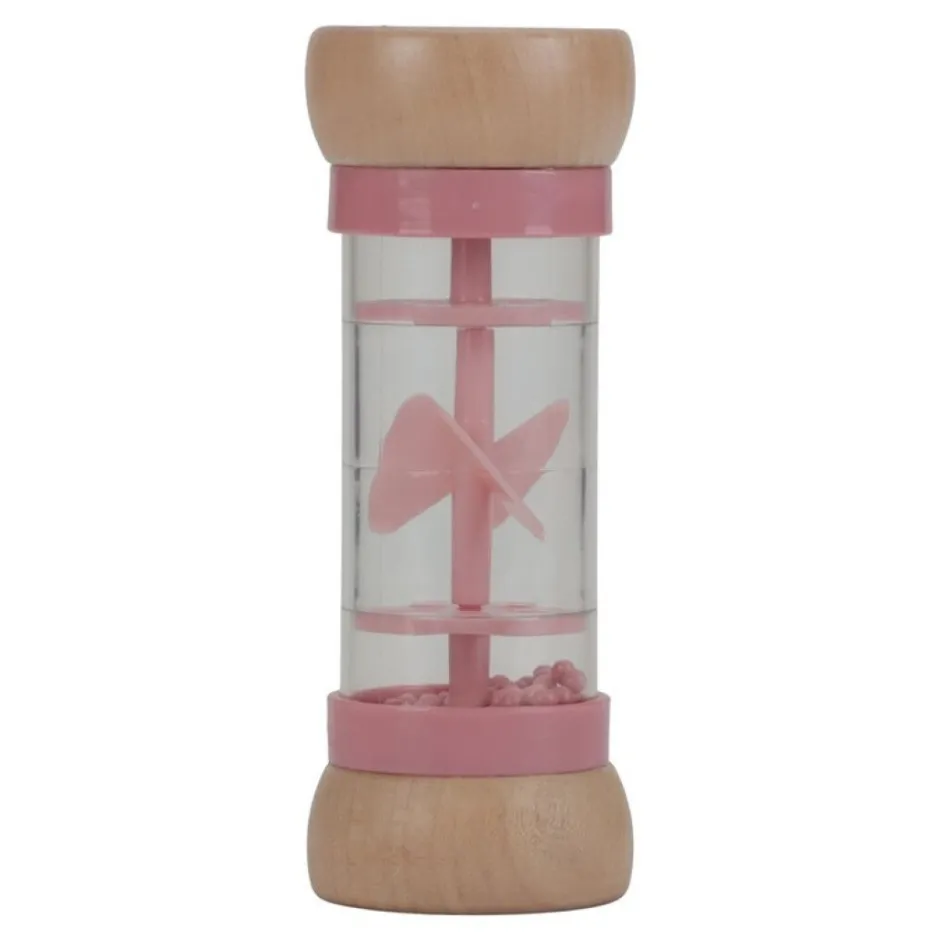 Dale la vuelta al sonajero de lluvia y las gotas se moverán hacia el otro lado haciendo suaves sonidos de gotas de lluvia.