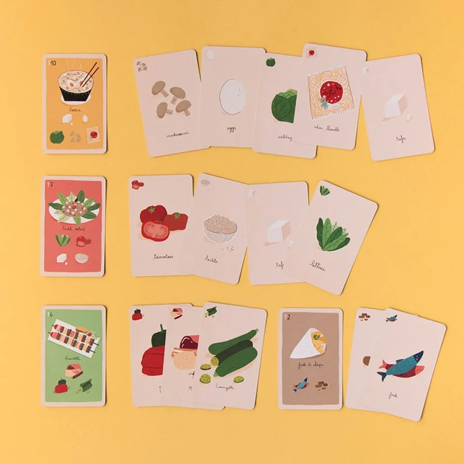 El juego incluye 17 cartas de recetas con platos de todo el mundo y 63 cartas de ingredientes.