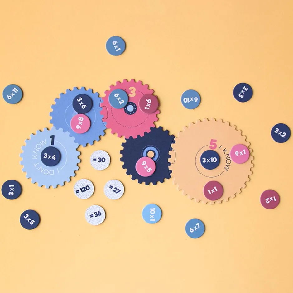 El objetivo es llevar todas las fichas desde el engranaje 1, I don’t know (no lo sé), hasta el 5, I know (lo sé), y, de este modo, aprender las tablas de multiplicar que nos hemos propuesto.