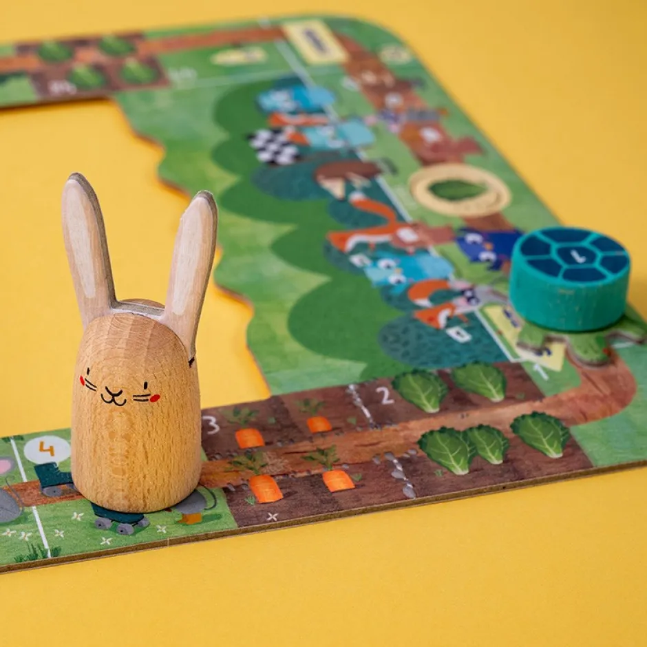 Un juego cooperativo muy divertido inspirado en la fábula de la liebre y la tortuga, a partir de 5 años. Juego sostenible hecho de cartón y madera. Fabricado en Barcelona.