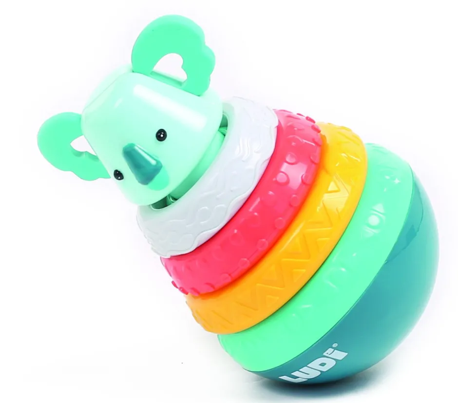 Un cubo con gomas elásticas para meter y sacar formas, un spinner con estimulación sensorial y una pirámide con anillas para encajar.