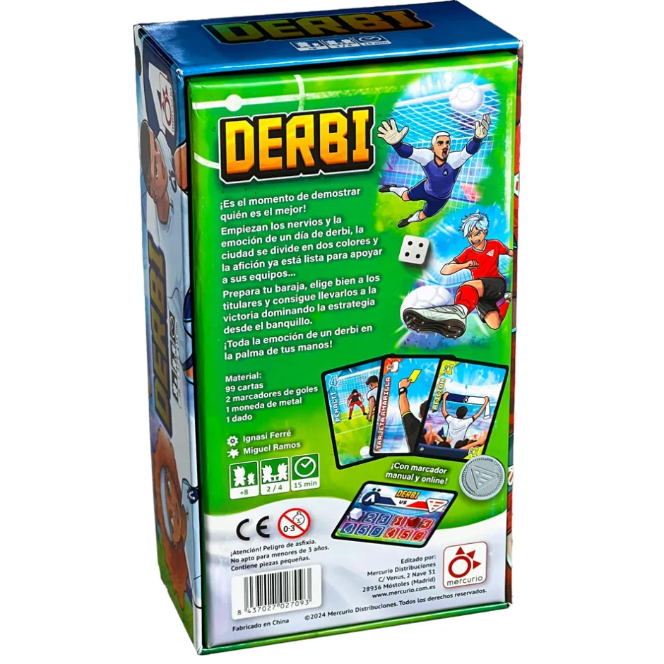 Derbi recrea la tensión y diversión de un partido de fútbol en muy poco tiempo, con unas reglas sencillas y con solo cartas y un dado.