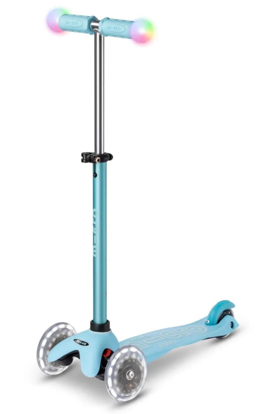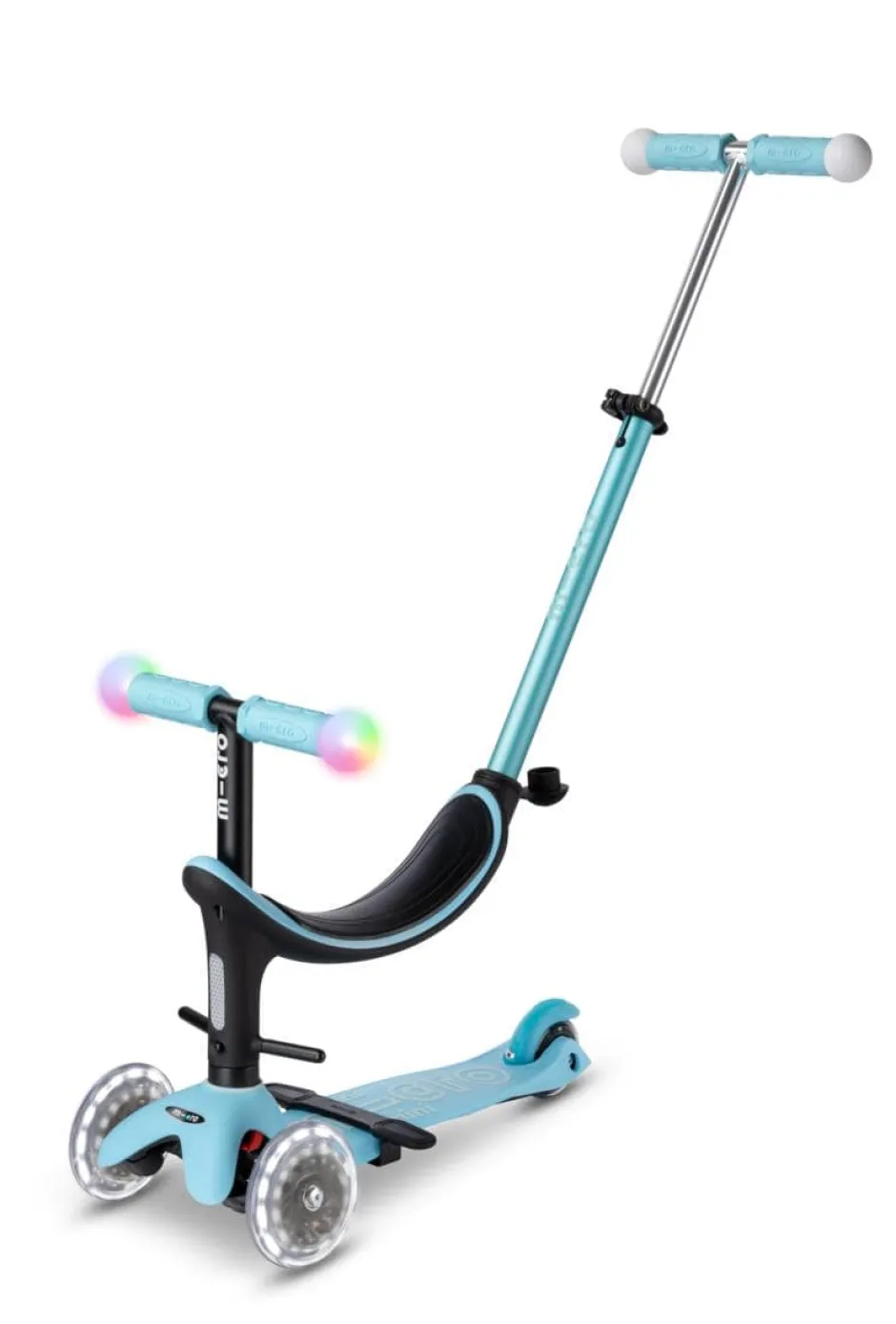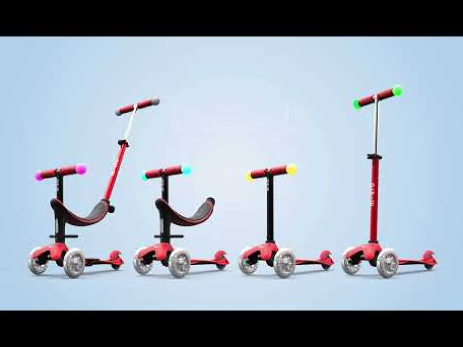 El innovador y ergonómico patinete todo en uno se puede utilizar en diferentes variantes: al principio con asiento, dos opciones de reposapiés y barra de empuje para los padres, posteriormente sin barra de empuje, como una mezcla entre bicicleta de equilibrio y patinete y finalmente como un Mini Micro Deluxe clásico con luces LED mágicas en los extremos del manillar y ruedas lunares LED.