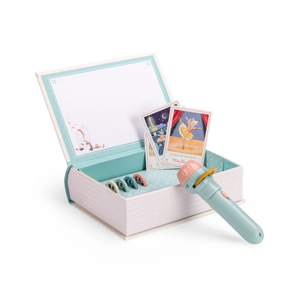 Caja magnética con forma de libro. La tapa se puede usar para proyectar la imagen. Incluye linterna y 5 discos de cuentos