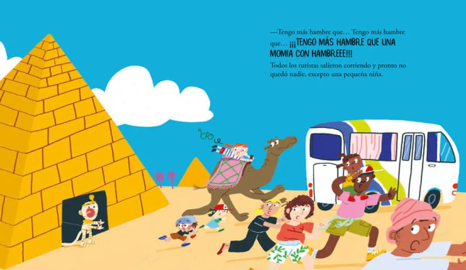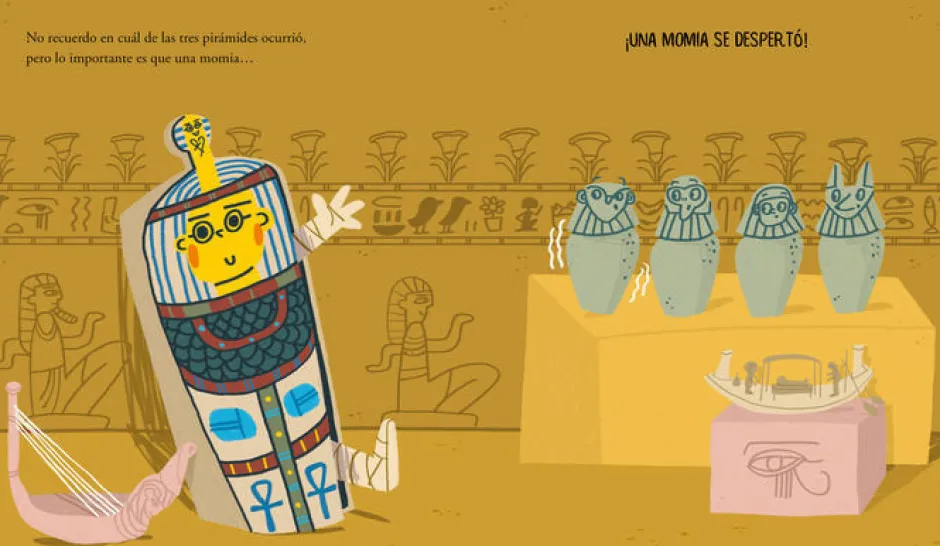 La pequeña momia Endas se despierta dentro de la oscuridad de su pirámide porque tiene hambre, ¡MUCHA HAMBRE!