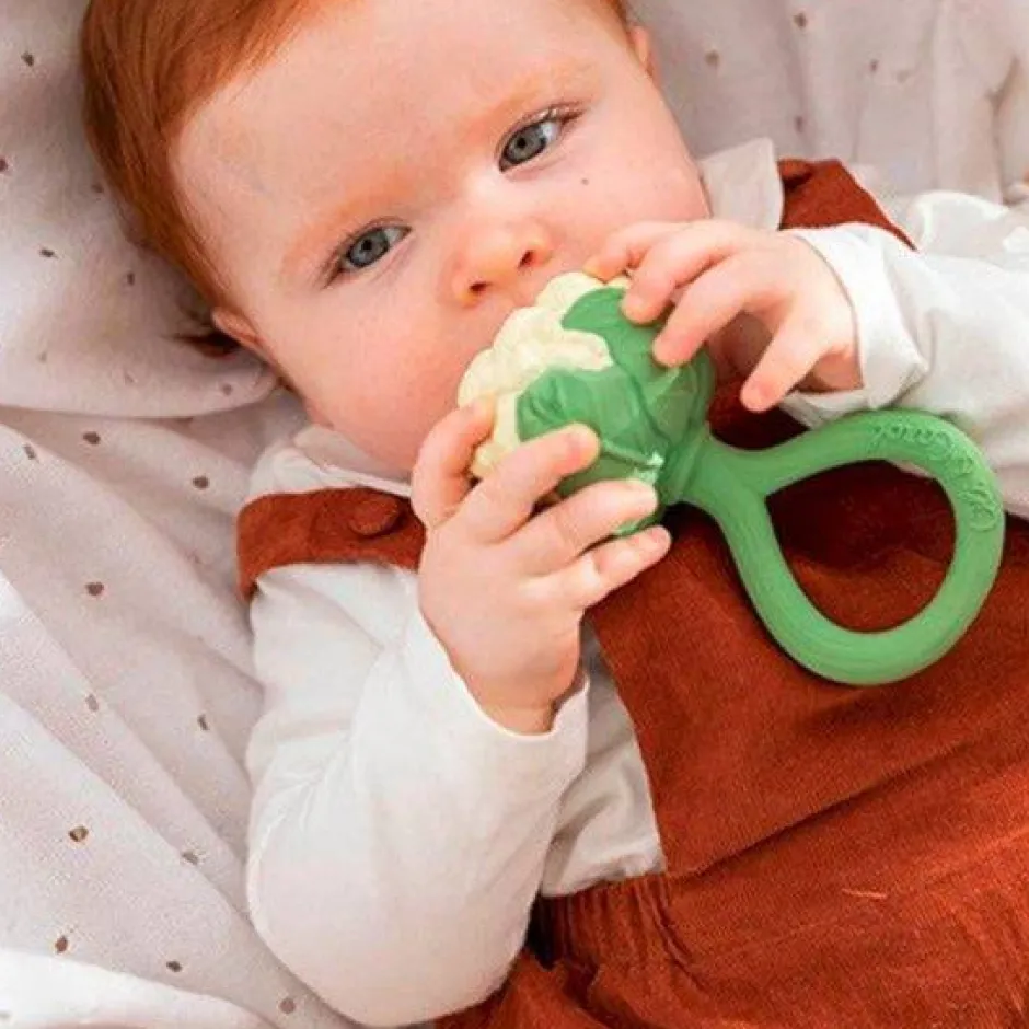 El sonajero de coliflor de Oli&Carol es EL SONAJERO MÁS ECOLÓGICO DEL MERCADO. Su exterior está hecho de caucho 100% natural, y en su interior hay semillas de cereza recicladas que convierten este mordedor en un sonajero. ¡2 en 1!
