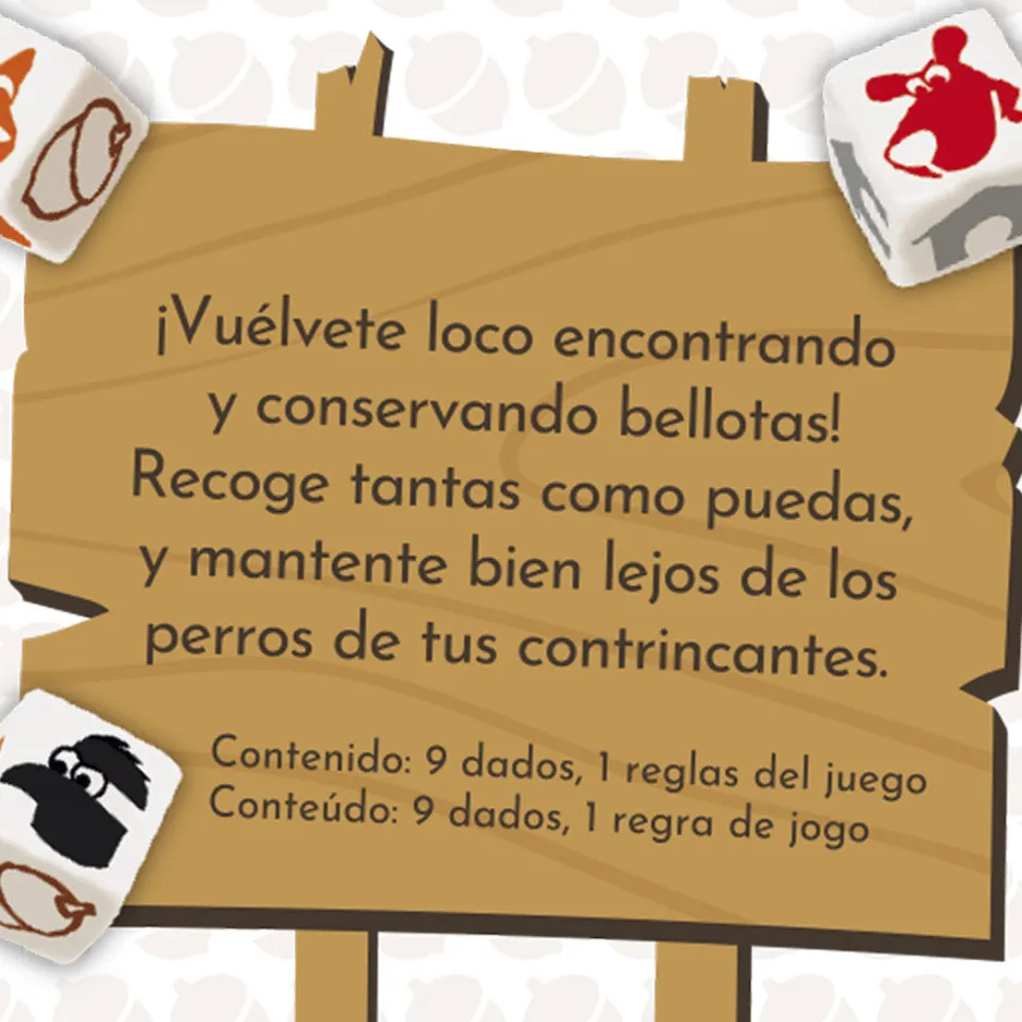 Contenido de cada juego: 9 dados: 5 dados de ardilla (cada uno con 3 ardillas, 2 bellotas y 1 arrendajo), 4 dados de perro (cada uno con 1 perro y 5 casitas para perros)