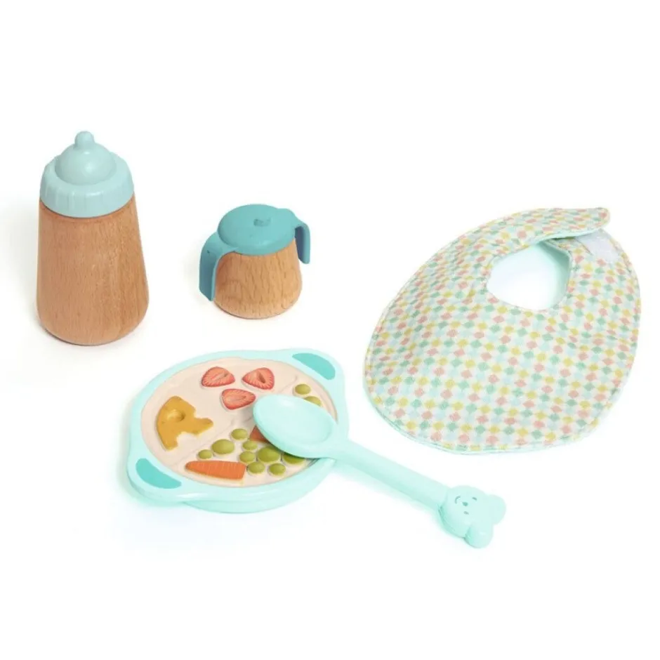 Los niños encontrarán un plato con compartimentos, una cuchara, un vasito, un biberón y un babero, ofreciendo una experiencia divertida y educativa.