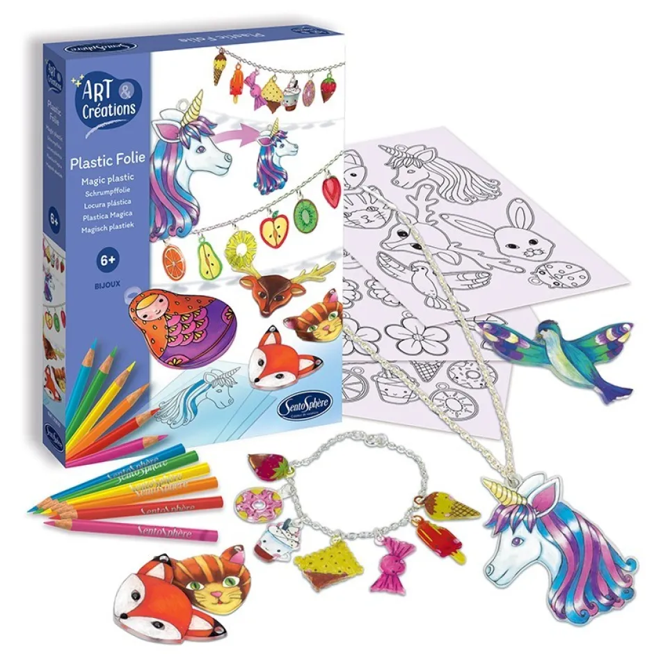 Diviértete creando bonitos abalorios y artículos de bisutería de plástico termorretráctil. Colorea los diseños impresos y precortados en las láminas de plástico antes de meterlas en el horno a 180°C.