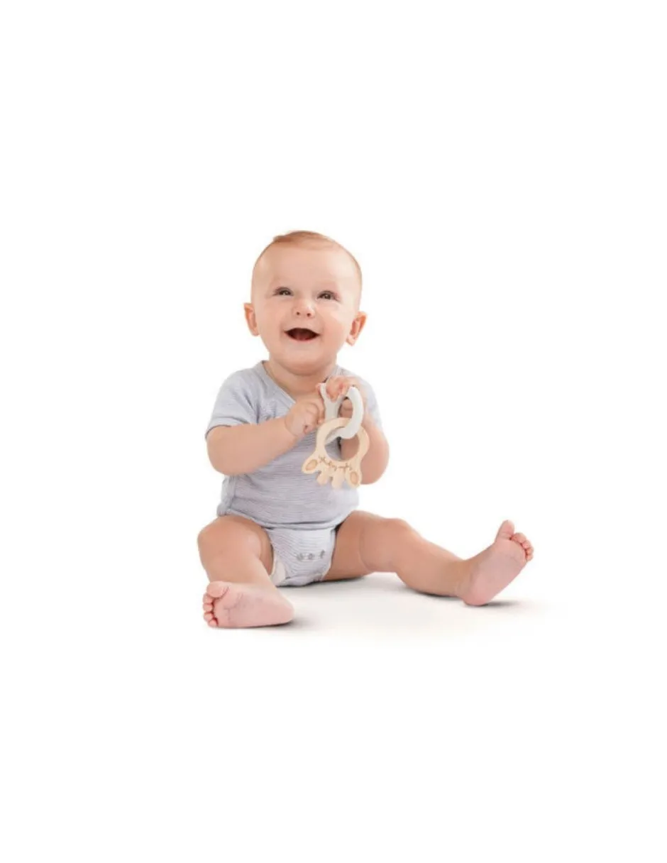 Este mordedor con la silueta de Sophie la girafe fabricados con productos naturales. Estos anillos de la jirafa Sophie están compuestos de caucho 100% natural y madera de Hevea, con el objetivo de ser un producto más respetuoso con el planeta.