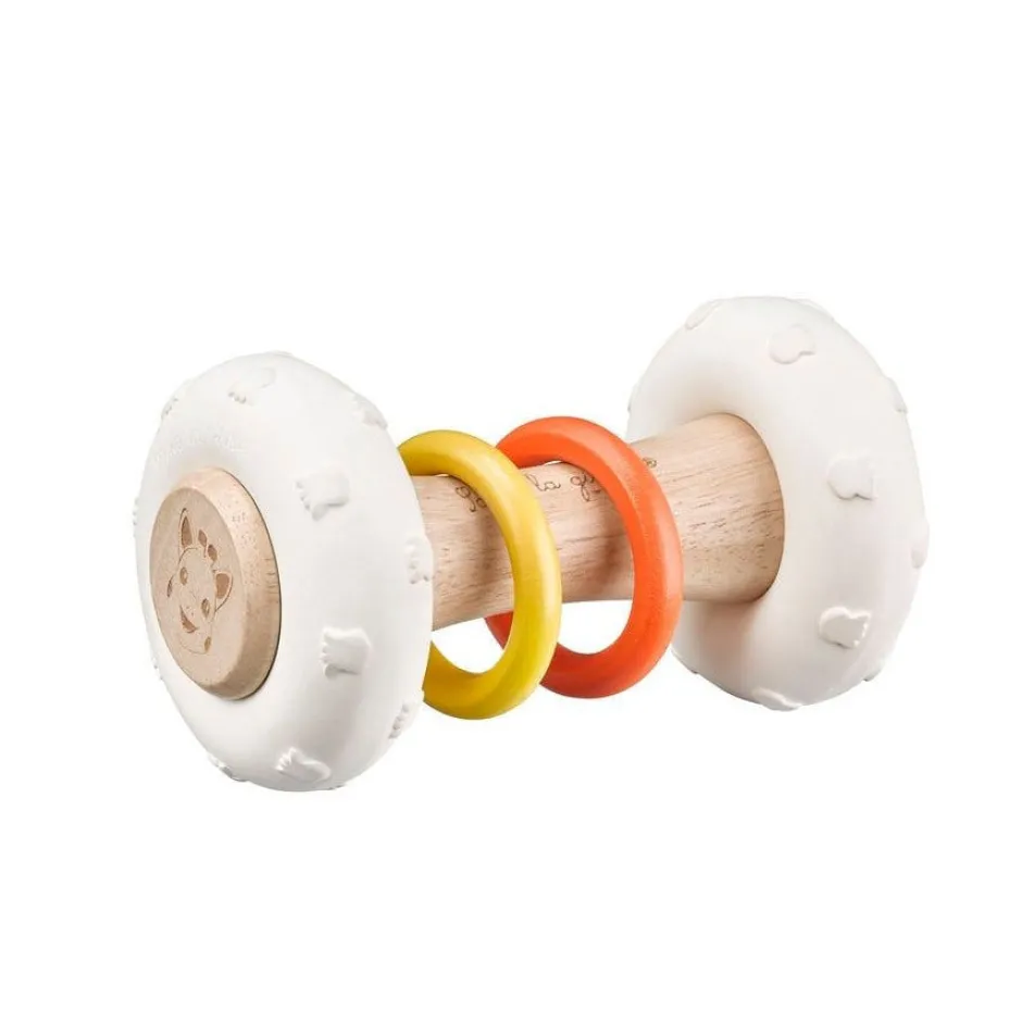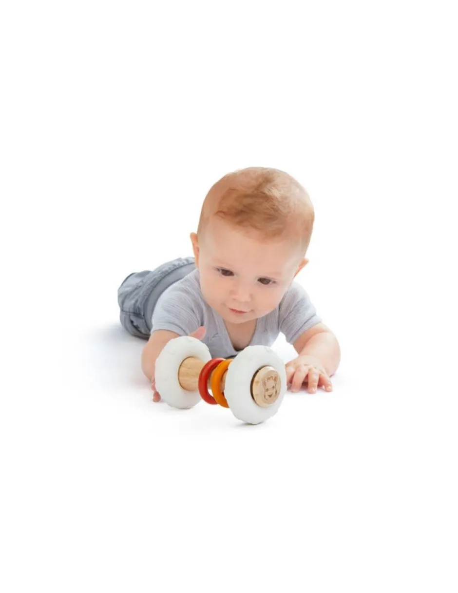 Por otro lado, sus 2 coloridos aros de madera de caucho generan un poco de ruido por lo que esto estimulará su sentido del oído.