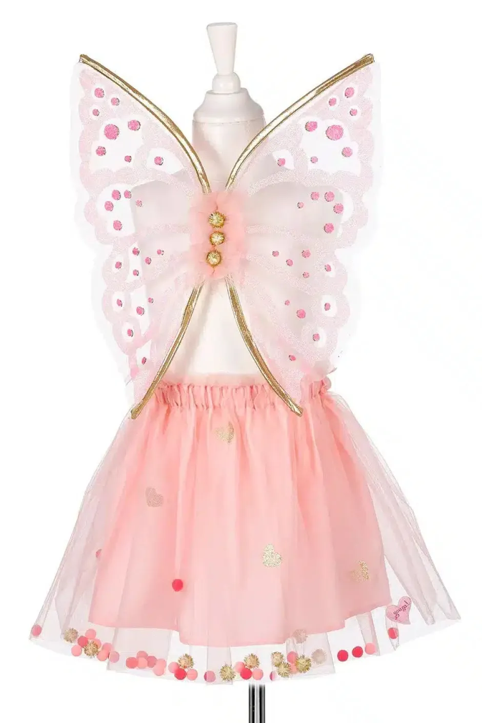 Conjunto de falda rosa con tul transparente y alas a juego. ¡Serás el hada más bonita!