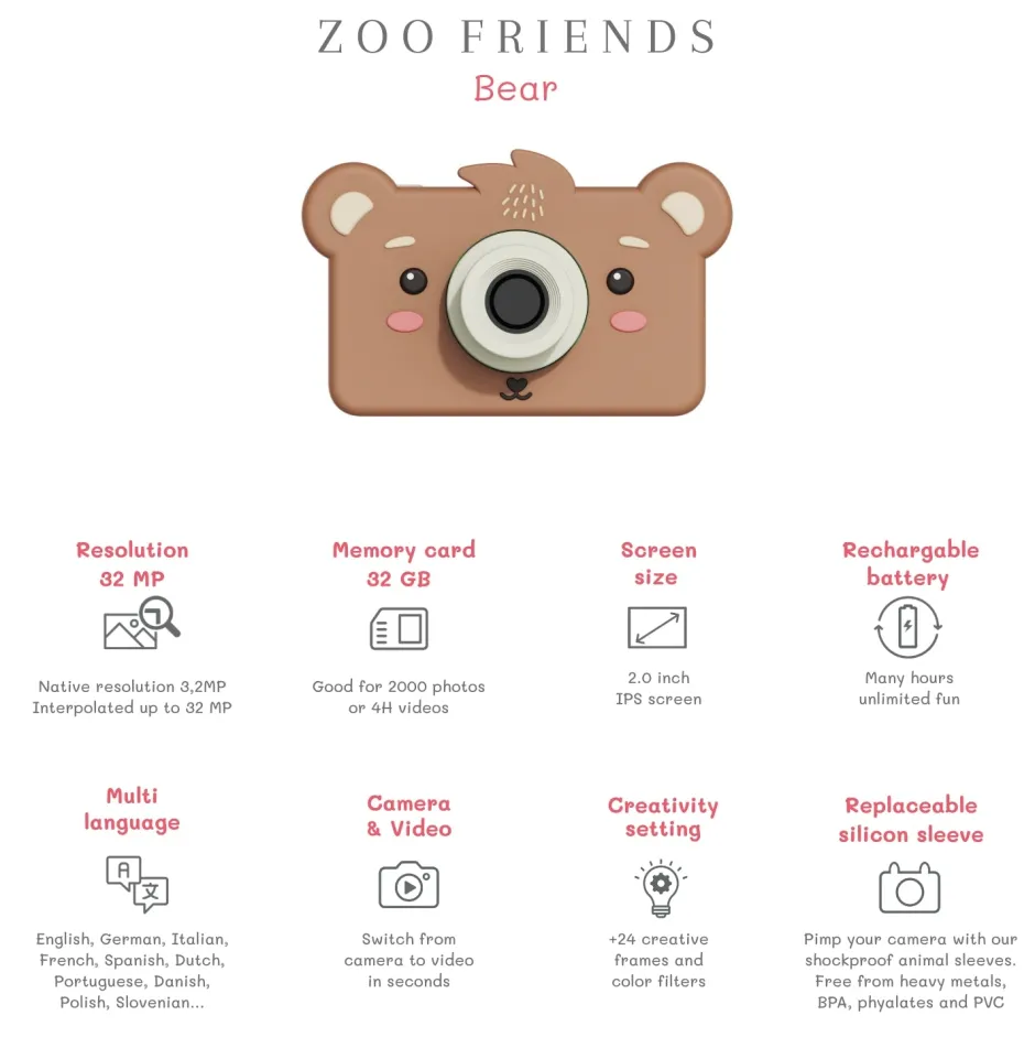 La Zoo Friends es una cámara digital con forma de animalitos ideal para los niños. Su cálida carcasa de silicona les anima a hacer fotos. La cámara está diseñada ergonómicamente para que las manos de los más pequeños puedan sujetarla y manejarla con facilidad.
