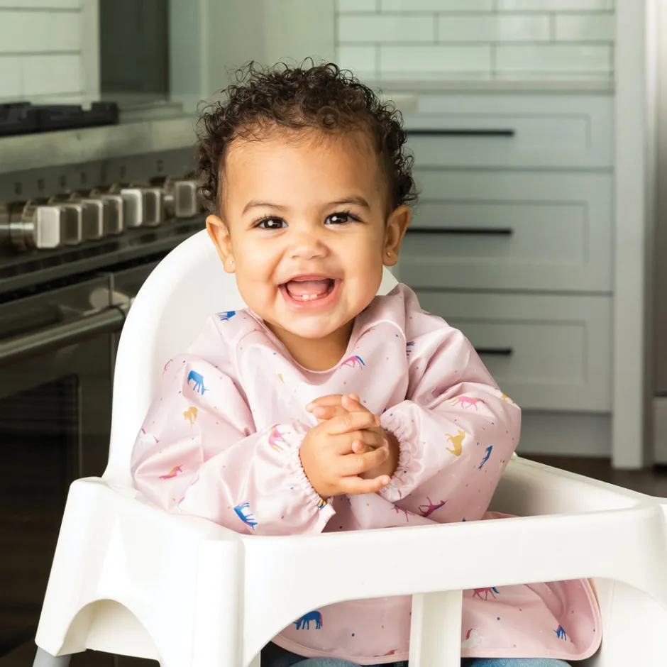 El bolsillo grande con tapa permanece abierto para recoger los derrames y los alimentos.