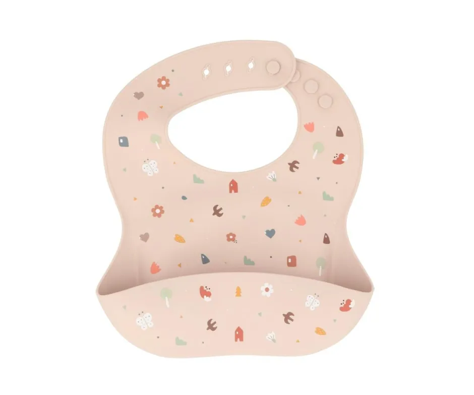 Babero de silicona con un bolsillo recogemigas para evitar que caiga la comida a la ropa.