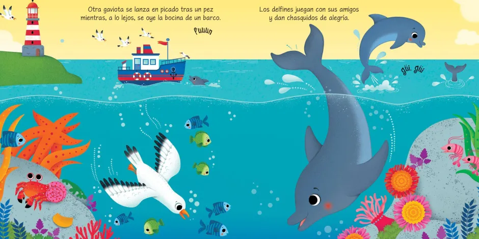 Este libro sonoro es perfecto para que los más pequeños descubran la magia del mar mientras escuchan los sonidos de las gaviotas, los delfines o el vaivén de las olas, y observan las bonitas ilustraciones llenas de detalles.