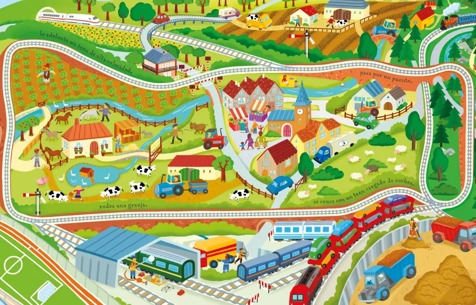 Libro y juguete en uno. Este libro de cartón de gran tamaño incluye un tren de vapor que circula por la vía. Los niños solo tendrán que darle cuerda y colocarlo sobre las vías para ver cómo atraviesa la ciudad, las montañas y los ríos hasta llegar al museo ferroviario. Hay cuatro vías incrustadas en las páginas, que se pueden utilizar por separado o encajarlas para construir una vía de tren gigante.