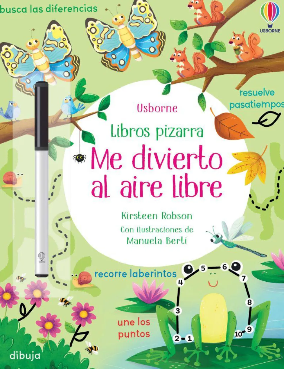 Un libro pizarra con actividades inspiradas en la naturaleza como laberintos, unir con puntos, encontrar las diferencias o trazar los números con el rotulador de tinta borrable incorporado.
