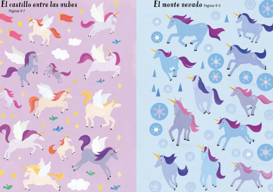 Más de 300 pegatinas reutilizables para completar escenas llenas de magia en las que hay cascadas, arcoíris, bosques, lagunas, cuevas de cristal y otros lugares favoritos de los unicornios.