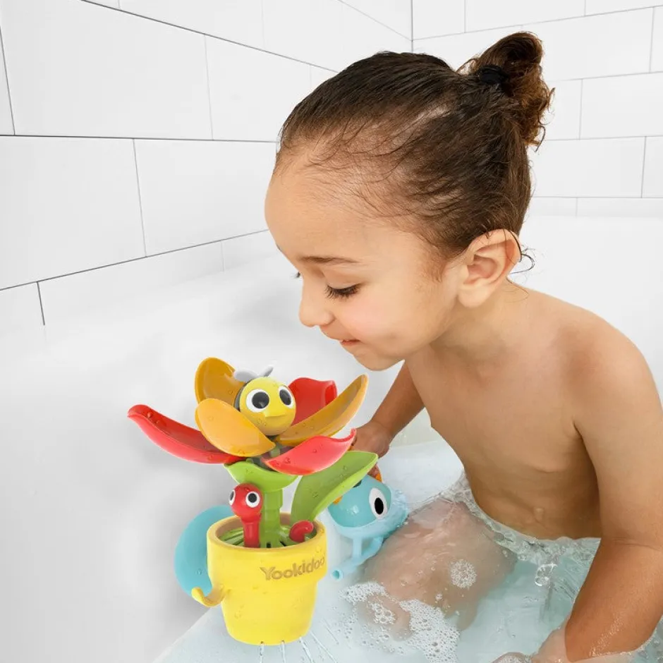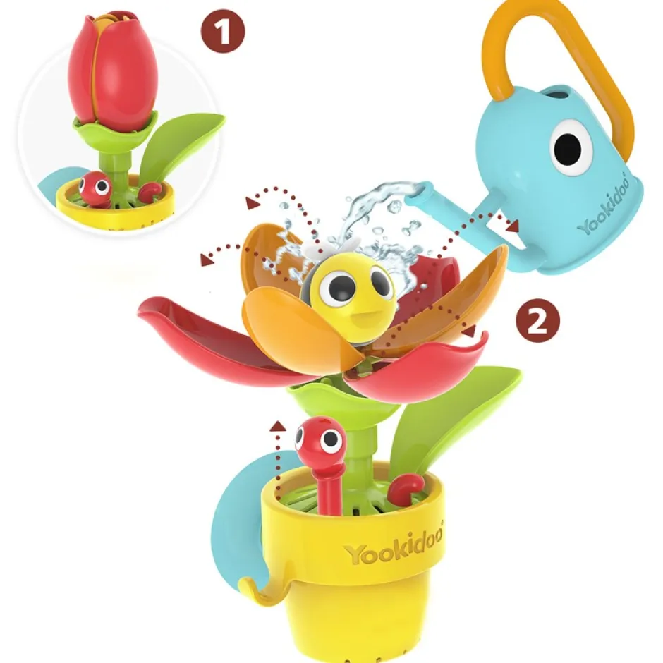 Riega la flor, los pétalos de la flor se abren para descubrir un cucu de abejita y un gusanito que aparece de la maceta.