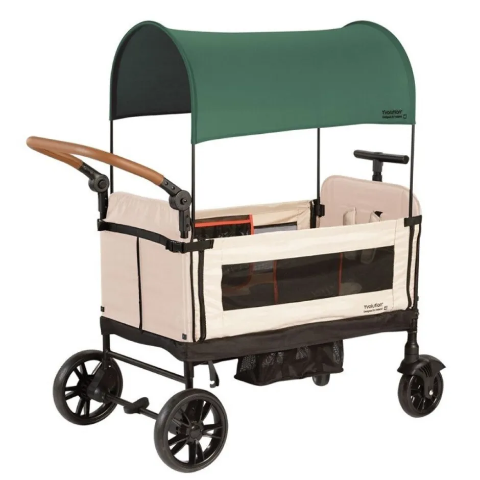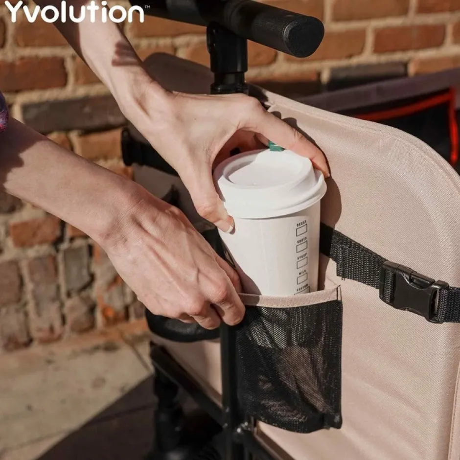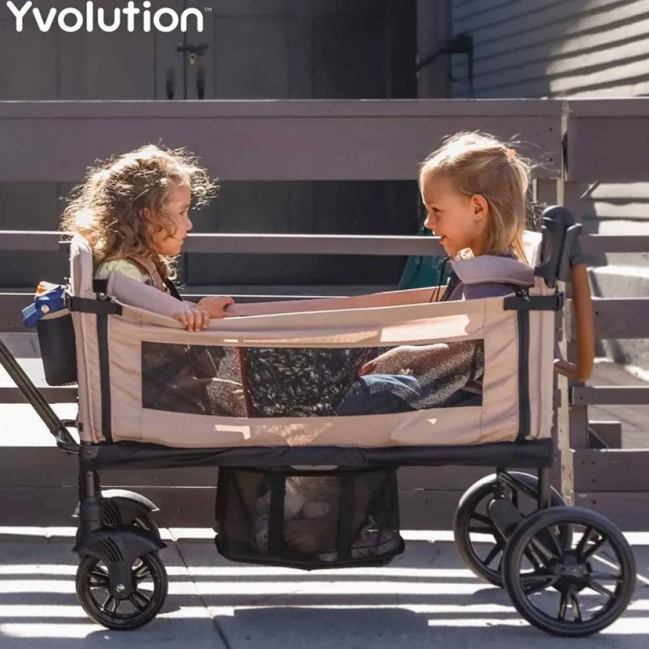 La mejor solución para un transporte versatil. El wagon de Yvolution sirve para múltiples fines. Es capaz de transportar dos niños a la vez, presentando dos sets con arneses de 5 puntos y respaldo acolchado para que viajen cómodos. La compra de mamá y papá puede cargarse como si fuera un carrito de la compra y se dirige como si lo fuera. Las ruedas delanteras giran 360 grados para un manejo fácil mientras que las ruedas traseras llevan un freno de pie. Lleva un barra y ángulo ajustable. Apto a partir de 12 meses, su peso es de 10,8 kg.