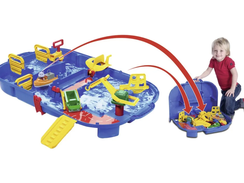 Conoce el superventas de AquaPlay, ¡el LockBox portátil! Deja que Wilma la Hipopótamo lleve el barco contenedor de viaje a través del popular sistema de esclusas utilizando la bomba. En el puerto, la grúa le ayudará a cargar el contenedor en el camión anfibio. Girando la rueda de paletas el agua fluye por los canales, una forma lúdica de educar sobre cómo se mueve el agua. Las horas de juego son infinitas y, una vez listo, es fácil plegar el conjunto en una maleta y llevárselo de viaje. Las posibilidades de ampliación son ilimitadas, ya sea con otros juegos AquaPlay o con ampliaciones.