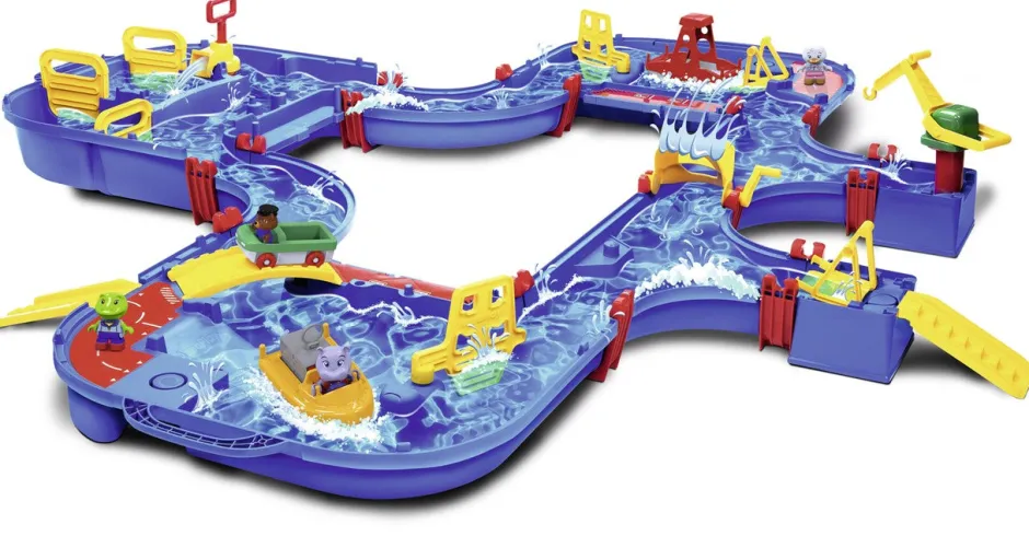 ¡Este genial sistema de canales de agua es enorme! Reúne a los niños y deja que jueguen juntos con los accesorios que aquí encontrarás para hacer volar la imaginación de los niños. El set incluye toda la familia de marionetas AquaPlay: el Oso, el Capitán Bo, Wilma la Hipopótamo, Lotta el Pato y Nils la Rana. Deja que Bo conduzca los vehículos por las diferentes estaciones de juego; Wilma utilizará la grúa para descargar el barco contenedor en el puerto y Lotta mostrará cómo atracar el ferry en su estación de transbordador. El coche anfibio puede pasar de tierra al agua por una grada o al transbordador. A partir de ahí, los vehículos pueden continuar su viaje a través del popular sistema de esclusas, donde se regula el nivel del agua utilizando la bomba y moviendo las compuertas de la esclusa. Al girar la rueda de paletas el agua se pondrá en movimiento, AquaPlay es una forma lúdica de educar cómo el agua se mueve, se eleva y sube. La MegaLockBox también ofrece la posibilidad de separar dos de las mitades de la caja para juntarlas – ¡perfecto cuando quieres llevar AquaPlay a tus vacaciones o a tus amigos!