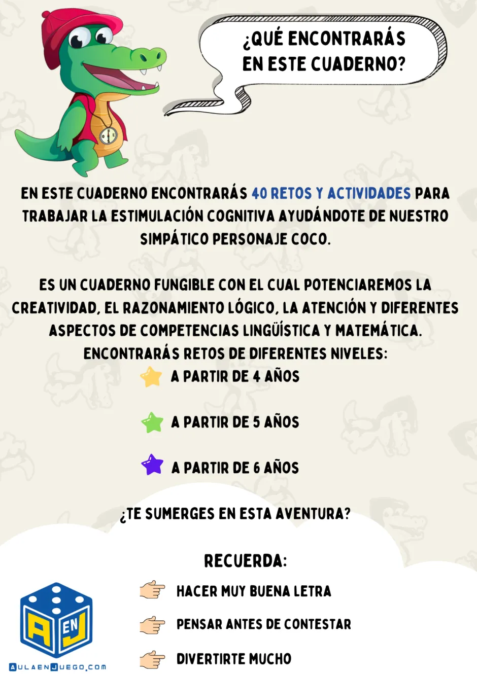 En este cuaderno encontrarás 40 retos y actividades para trabajar la estimulación cognitiva ayudándote de nuestro simpático personaje Coco en diferentes y progresivos niveles de dificultad.