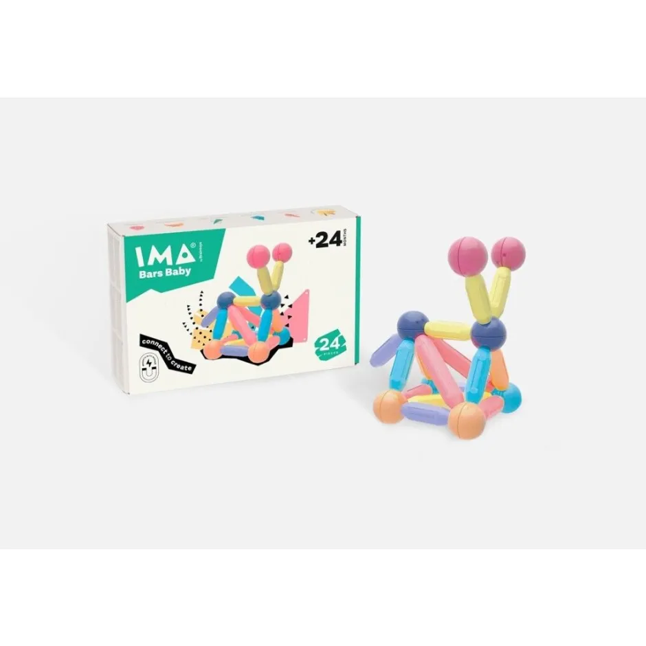 IMABARS contiene grandes bolas metálicas, que conecta con barras imantadas de 3 diferentes formas y largo. Con estas 4 piezas puedes crear infinitas figuras en plano y en 3D.