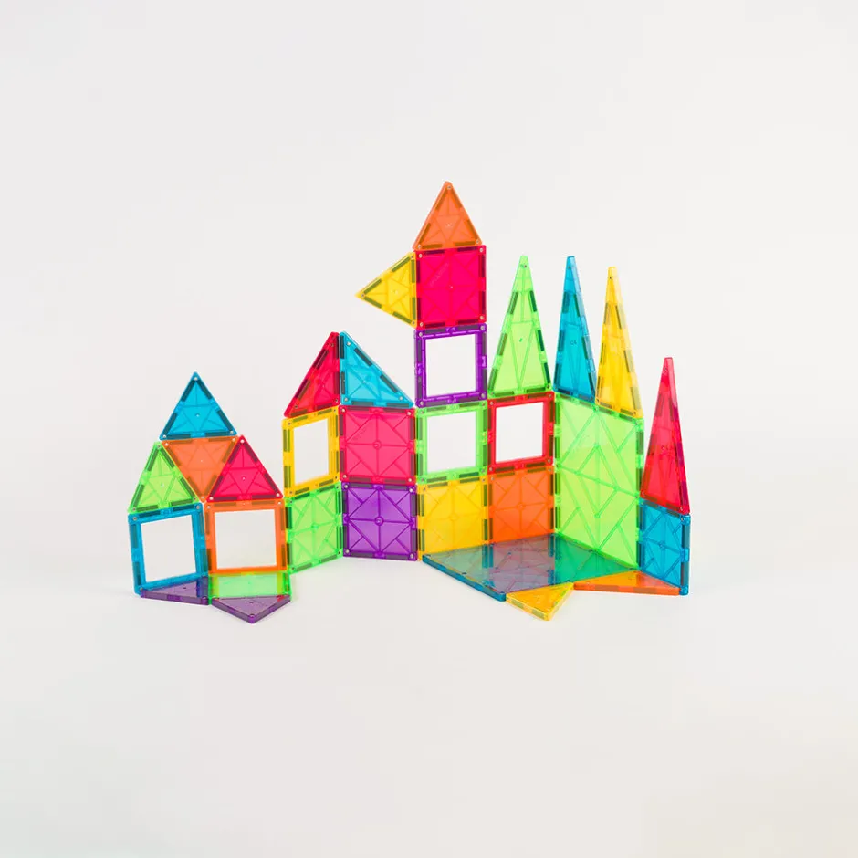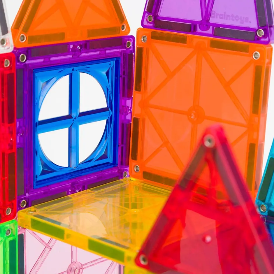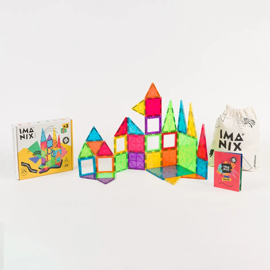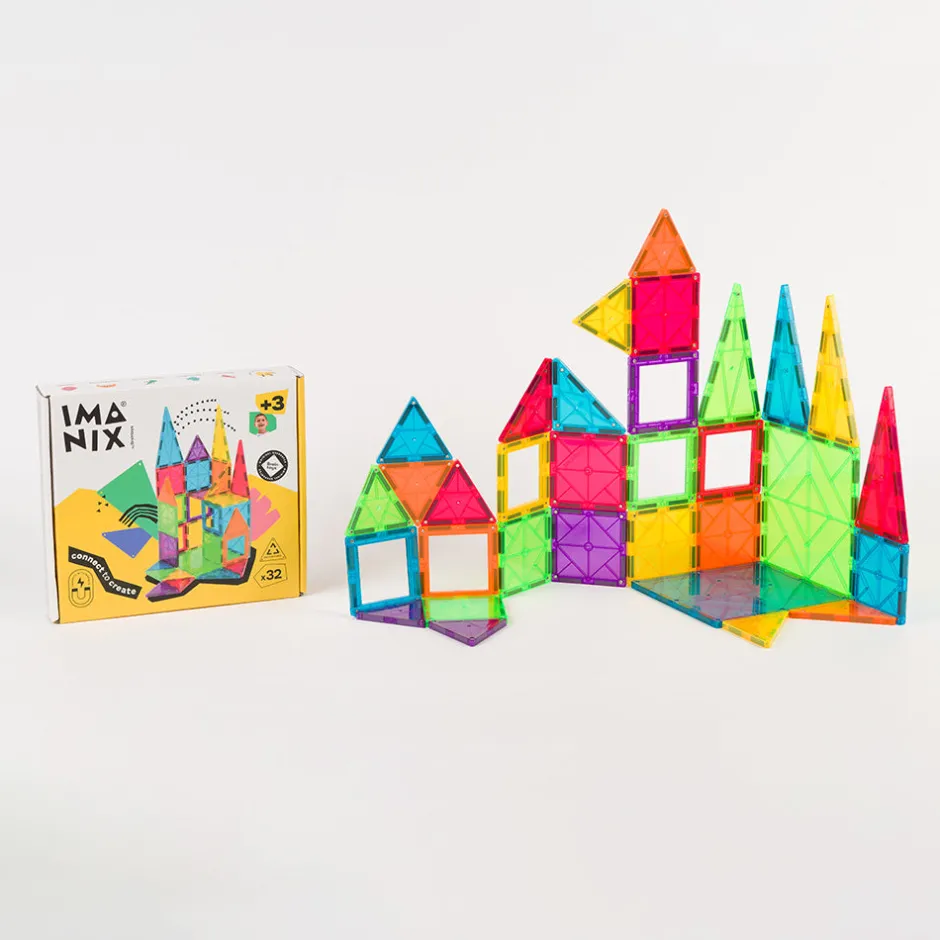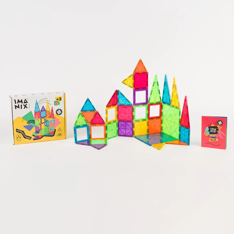 Imanix está compuesto de piezas geométricas de diferentes tamaños, formas y colores realizadas en plásticos no tóxicos traslúcidos cuyos perfiles contienen los imanes en su interior. Esta disposición de los imanes asegura que no exista ningún riesgo de que niños o niñas puedan tragarse por error un imán, ya que están incrustados en el interior de cada pieza y no son piezas sueltas. Además, estos Imanix 32 se presentan en una caja de dimensiones asequibles y repleta de diversión. Imanix 32 piezas contiene un surtido interesante de piezas para aproximarse a esta marca y empezar a imaginar y construir.