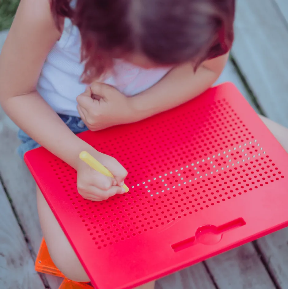 Para dibujar, solo basta deslizar el lápiz imantado sobre el tablero y las pelotitas metálicas irán apareciendo en la superficie, dando vida a tus creaciones en 2D.