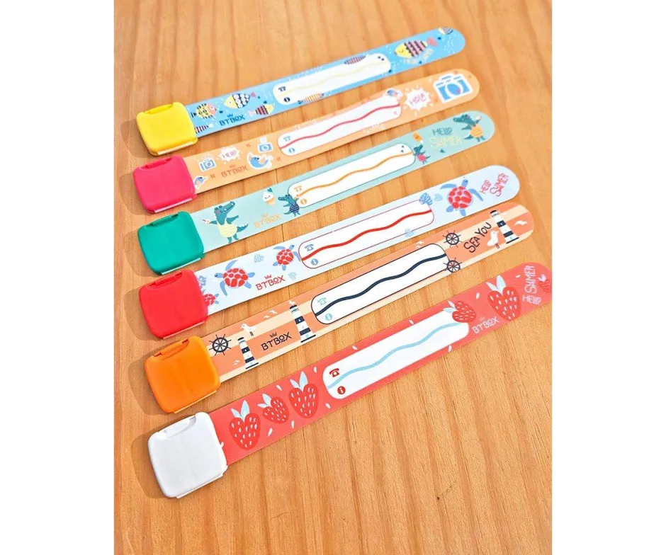 Las pulseras Infoband son una opción ideal porque se colocan en la muñeca de los niños/as y les permiten llevar datos como teléfonos, alergias y enfermedades consigo en todo momento.