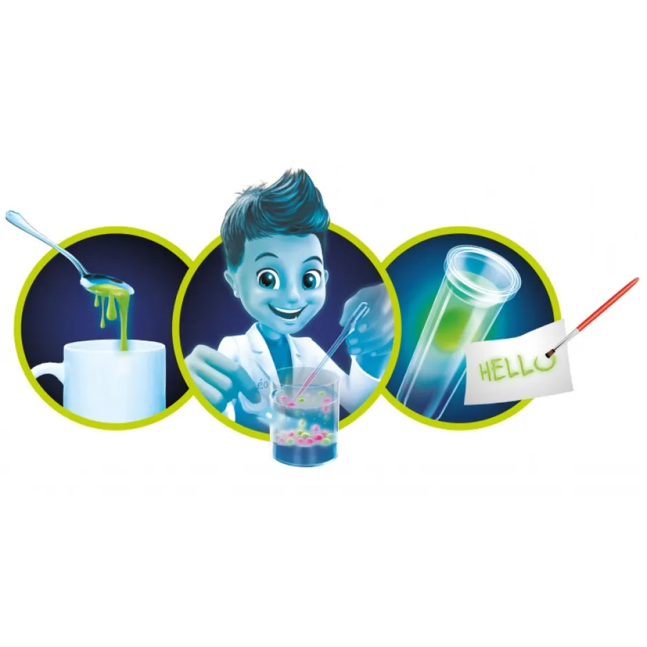 Este increíble set te ofrece nada menos que ¡15 desafíos! Slime fluorescente y fosforescente, pelotas saltarinas, lámpara de lava, experimentos con pintura luminiscente o con calor y frío, tinta invisible, estrellas fosforescentes, cristalización.