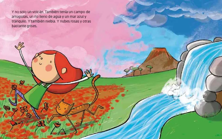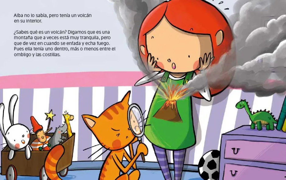 Alba también tiene un volcán dentro, pero es que el de Alba es un volcán muy grande, enorme, y a veces se enciende, explota e incluso escupe fuego y eso le da miedo a Alba y le asusta, porque ese fuego también hace daño a los demás. Pero una noche a Alba se le aparece una pequeña y bonita hada que le explica que ese volcán suyo es la “rabia” y que estalla cuando se enfada, por eso le enseña un truco para calmarse cuando sienta que el volcán amenaza con estallar de nuevo.