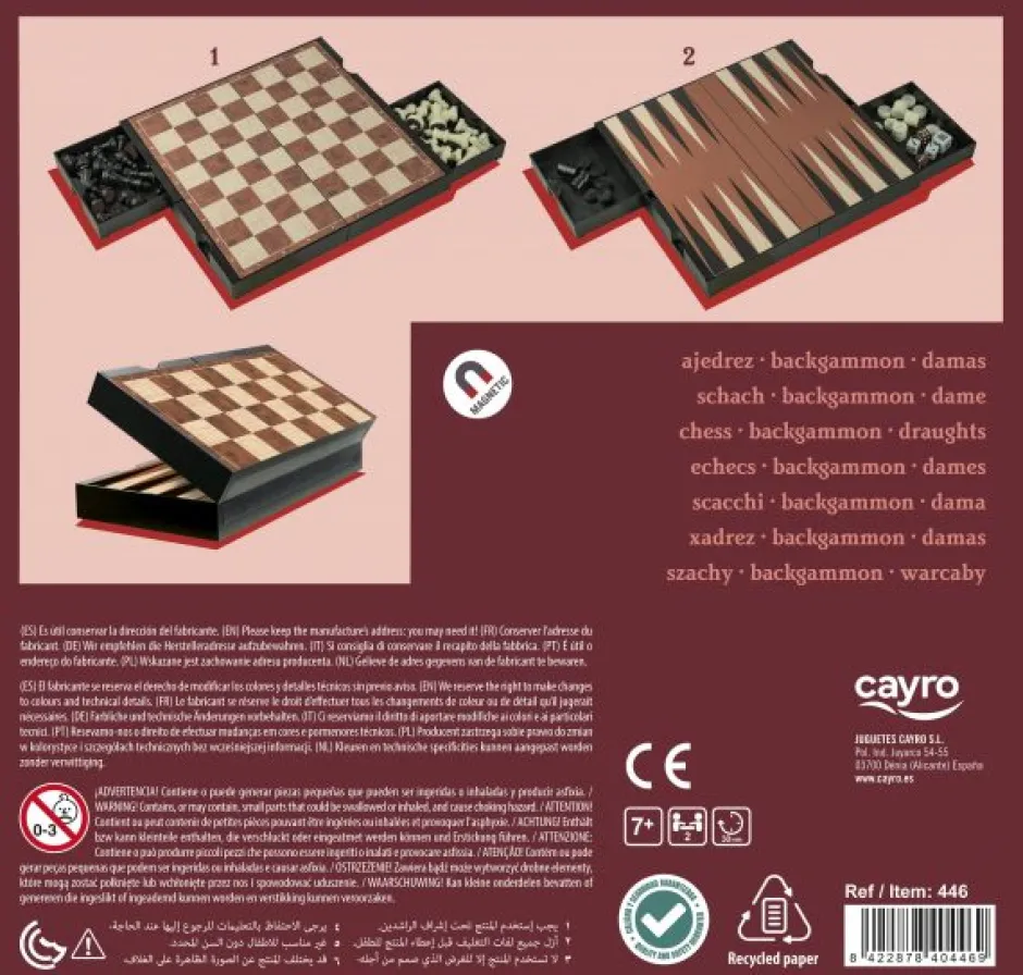 Con esta compacta caja podrás jugar a 3 juegos diferentes, ajedrez, damas y backgammon. Las fichas (magnéticas) están alojadas en los cajones y dependiendo en la posición que coloques el tablero de juego, podrás o no abrir el cajón.