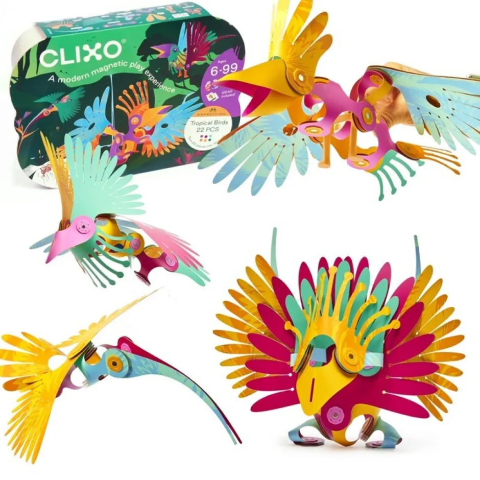 Vuela bien alto con el pack de aves tropicales de Clixo. Con un mecanismo de aleteo personalizado, piezas de vibrantes colores e inspiradas en la naturaleza. Este pack te invita a una aventura a través de las profundidades y las alturas de la selva tropical. Las piezas magnéticas y flexibles de Clixo inspiran la creatividad, fomentan el aprendizaje STEAM y permiten construir infinitas creaciones de aves, desde majestuosos tucanes hasta elegantes colibríes. Da rienda suelta a tu imaginación, explora nuevos mundos y descubre el poder del juego con Clixo.