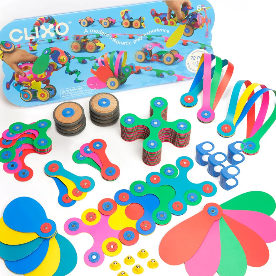 Este pack tiene 72 piezas en 10 formas únicas de CLIXO, incluidas ruedas y soportes. Las ruedas permiten llevar la experiencia de construcción al movimiento y la velocidad. Ya sea que haga clic en las ruedas de un automóvil o de un tren, de un pavo real rodante o de un elefante veloz, este pack lleva a los niños a descubrimientos creativos en movimiento.